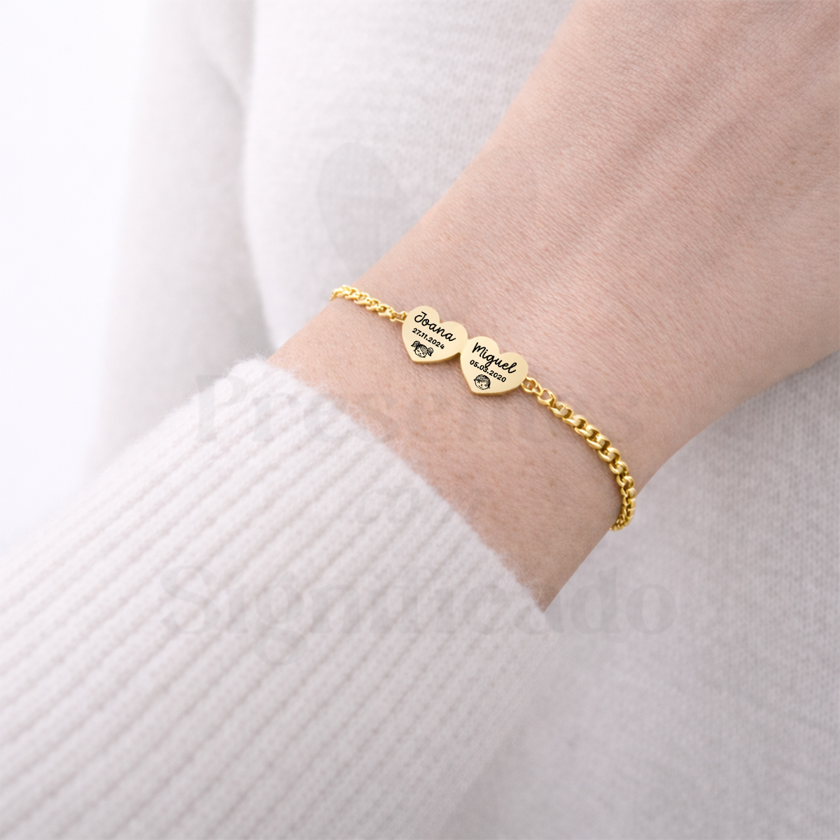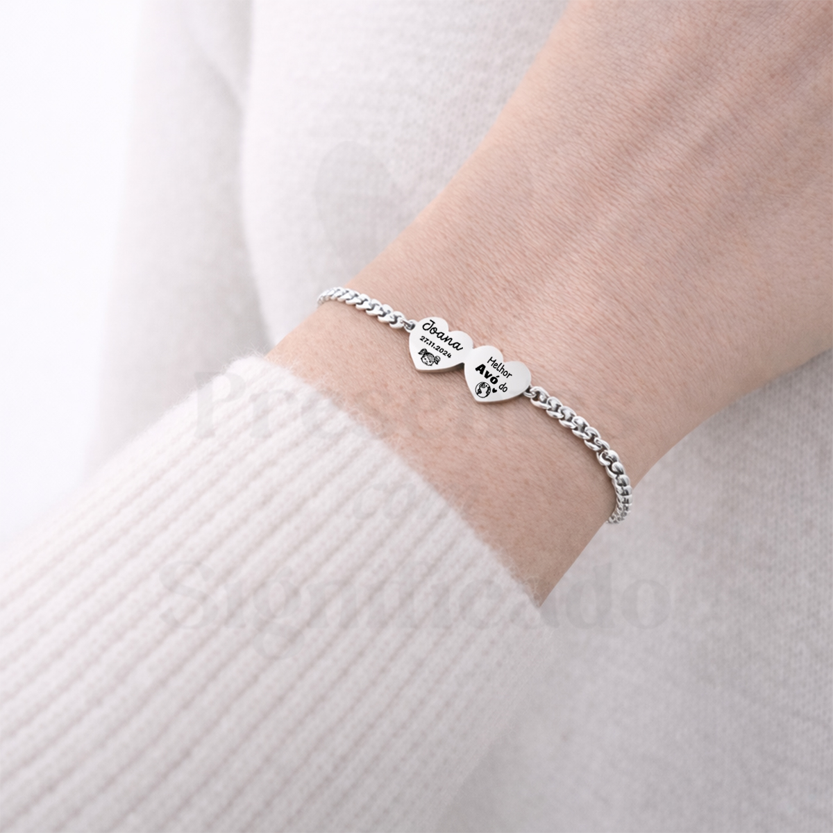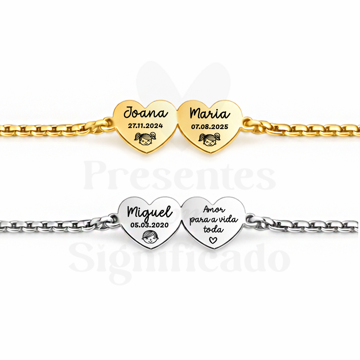 Pulseira c/ corrente grossa totalmente em aço inoxidável e ajustável. Conector formato dois corações pequeninos (10mm) gravados com nomes ou texto (máximo 5 palavras). Disponível em dourado ou prateado