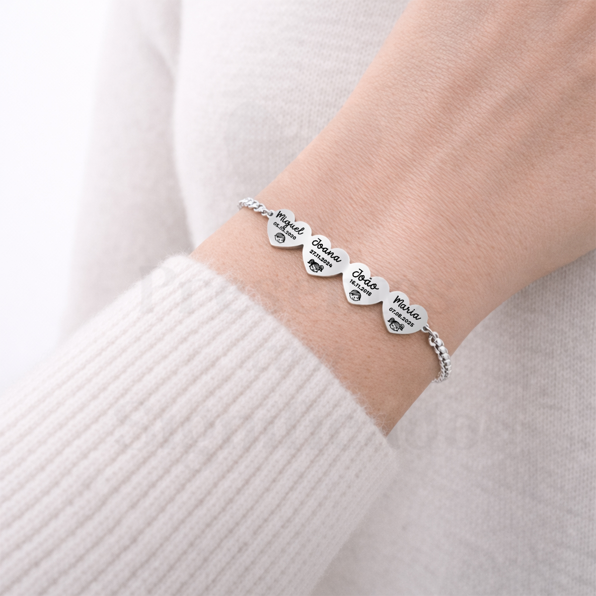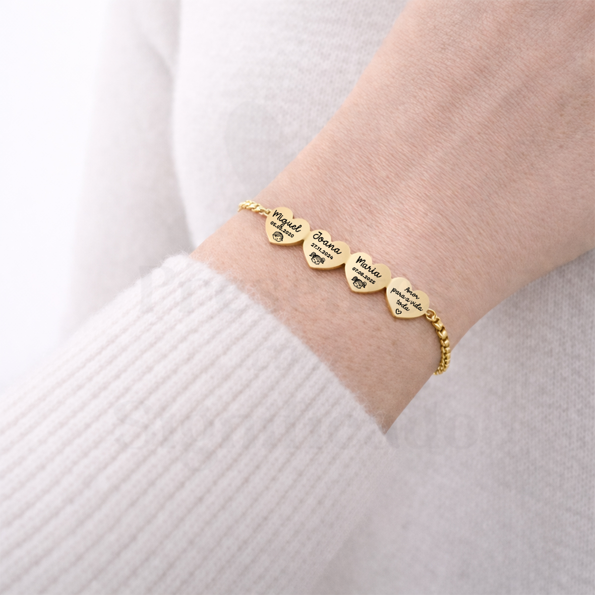Pulseira c/ corrente grossa totalmente em aço inoxidável e ajustável. Conector formato quatro corações pequeninos (10mm) gravados com nomes ou texto (máximo 5 palavras). Disponível em dourado ou prateado
