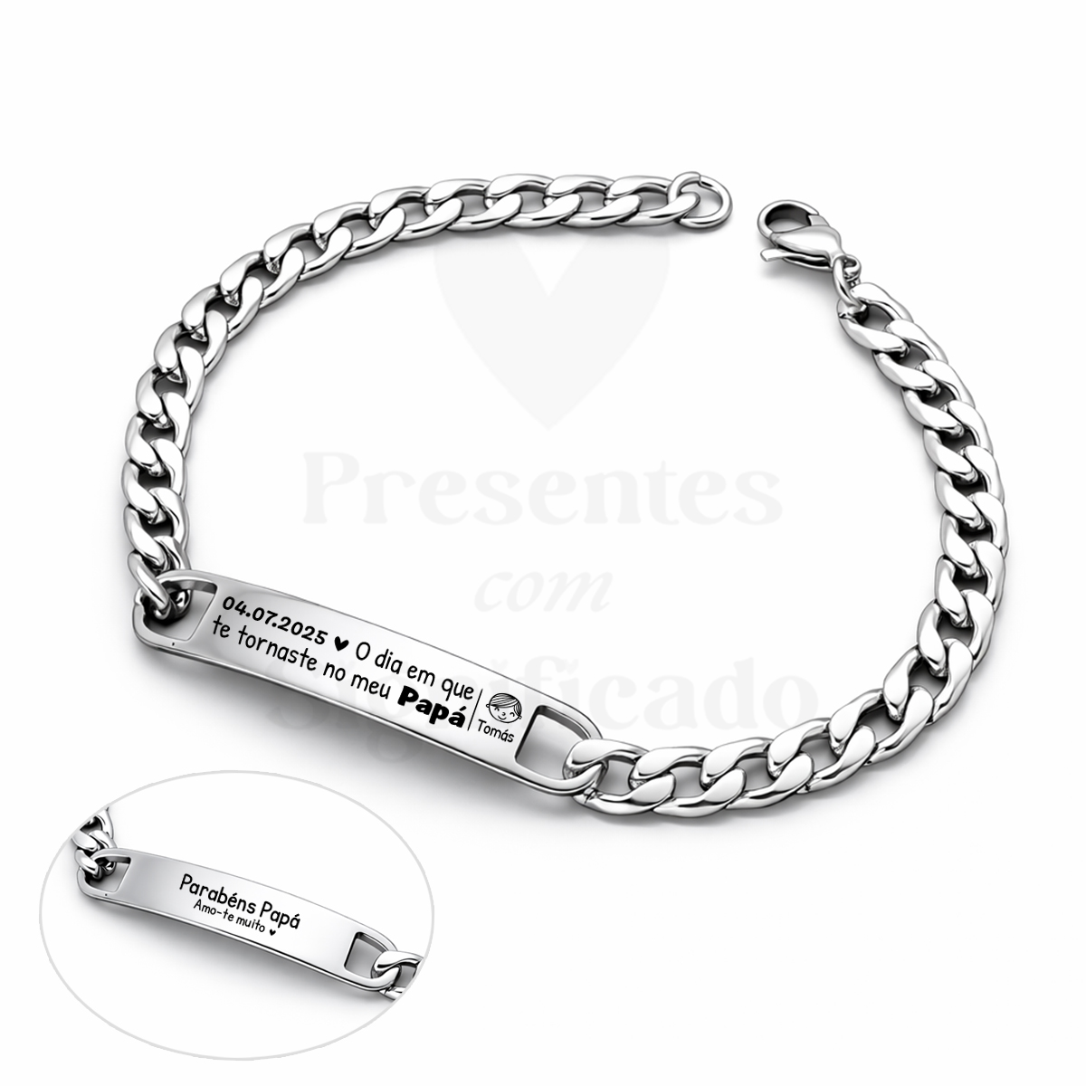 Pulseira masculina com corrente grossa e chapa retangular gravada a seu gosto, totalmente em aço inoxidável. Disponível com chapa de tamanho standard ou chapa + grossa.