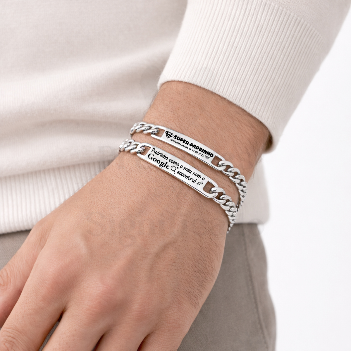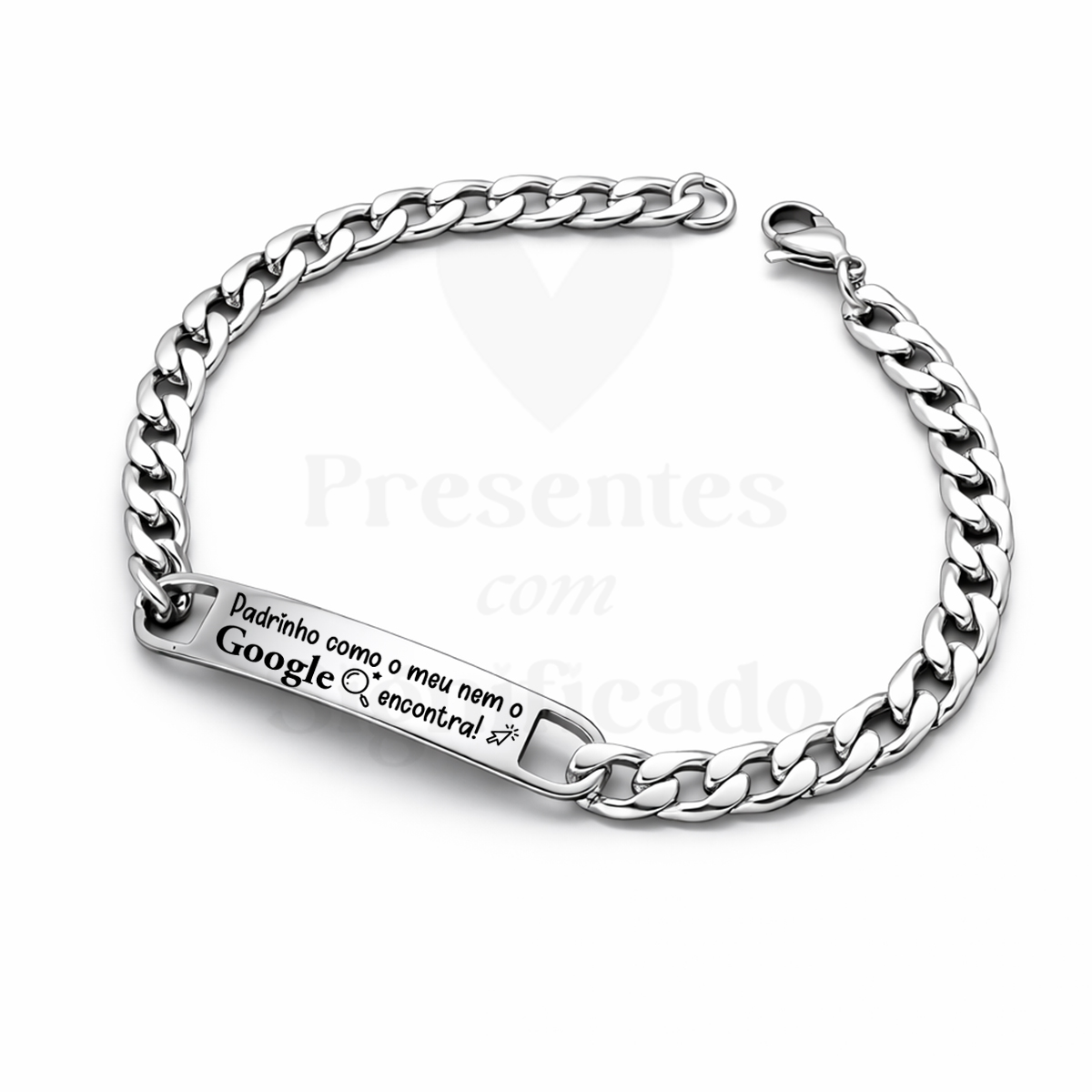 Pulseira masculina com corrente grossa e chapa retangular gravada a seu gosto, totalmente em aço inoxidável. Disponível com chapa de tamanho standard ou chapa + grossa.