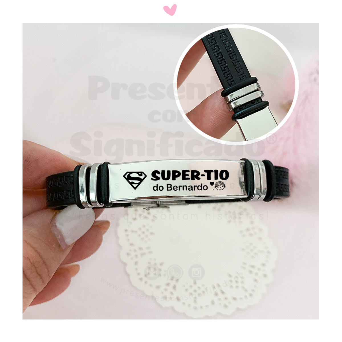 Pulseira masculina em couro preto e aço inoxidável com gravação personalizada. Gravamos qualquer texto que pretenda.