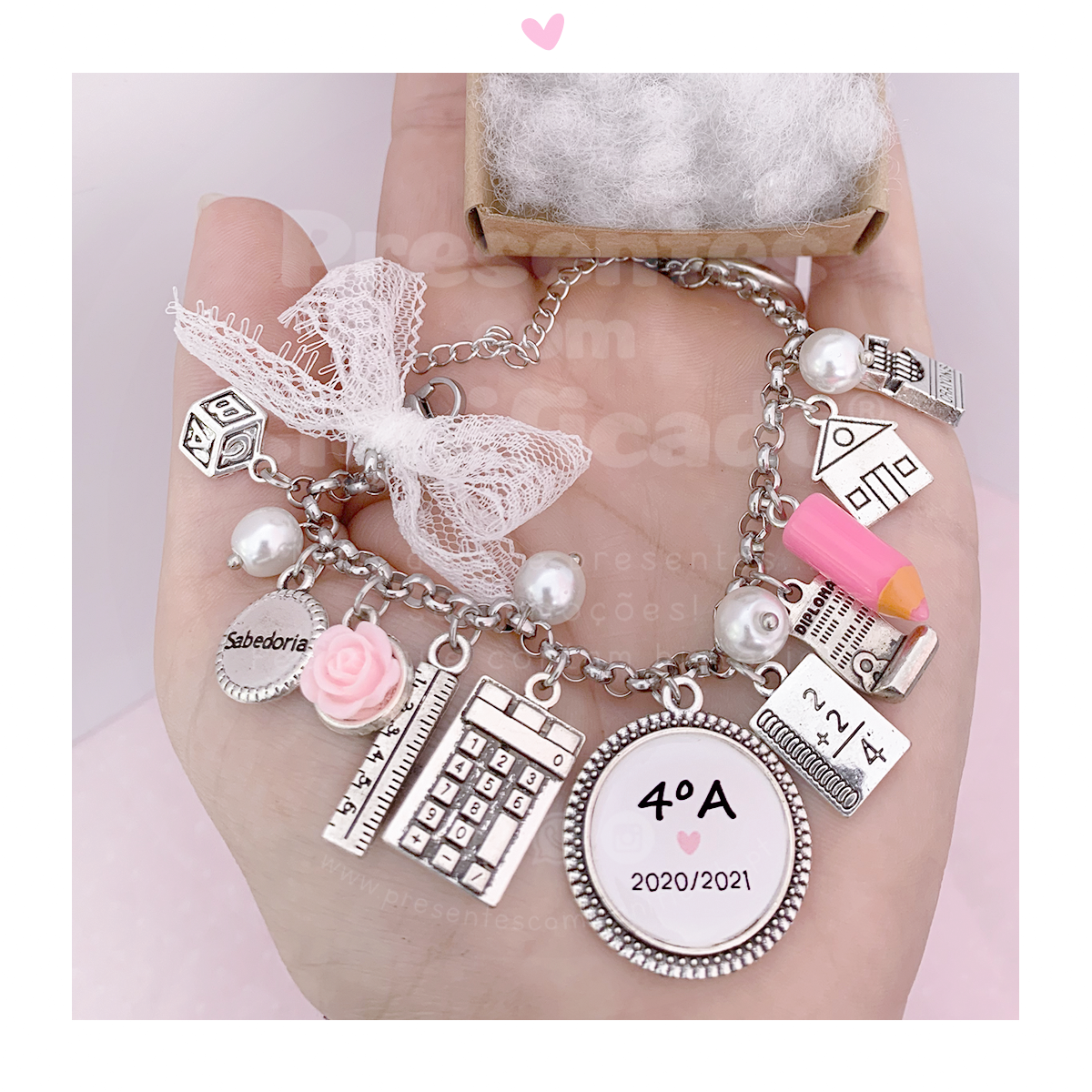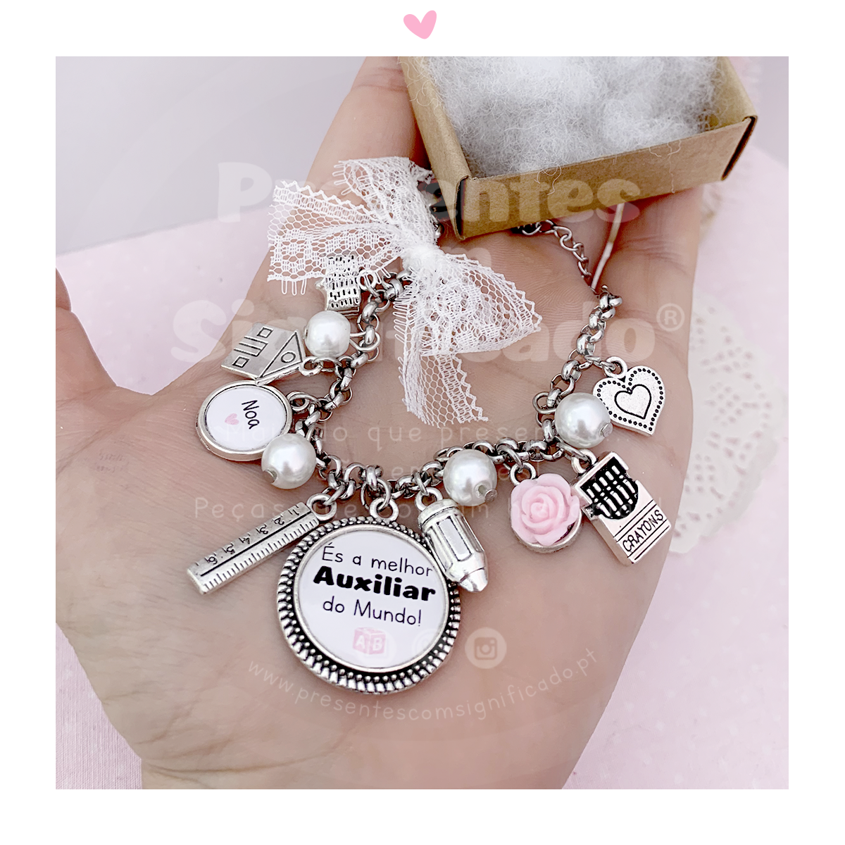 Pulseira ajustável em aço inoxidável c/ pendentes de metal temáticos e medalha central c/ texto à sua escolha.