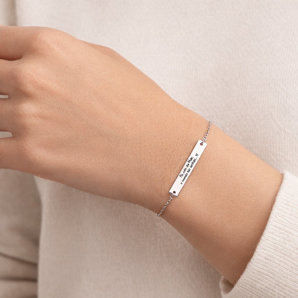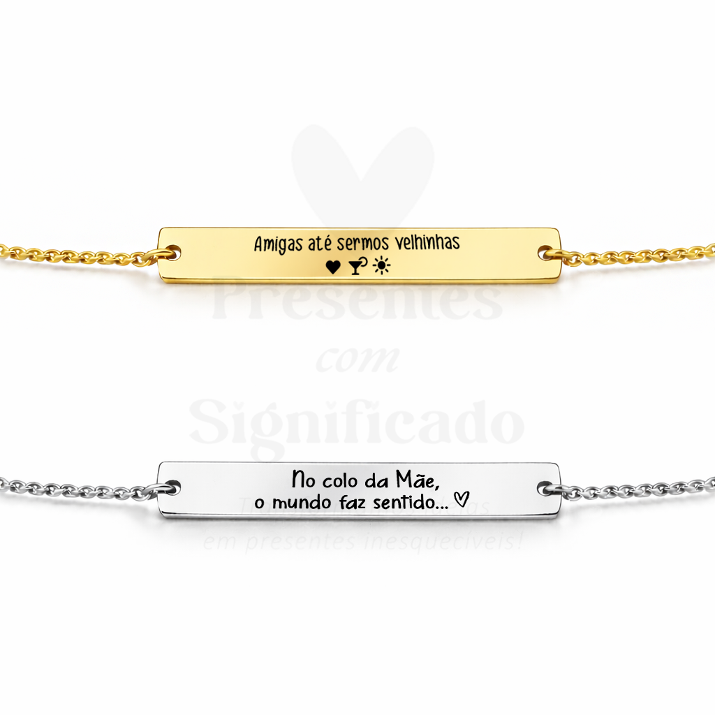 Pulseira c/ corrente delicada totalmente em aço inoxidável com travessão retangular c/ texto gravado a seu gosto. Possível acrescentar gravação no verso.
