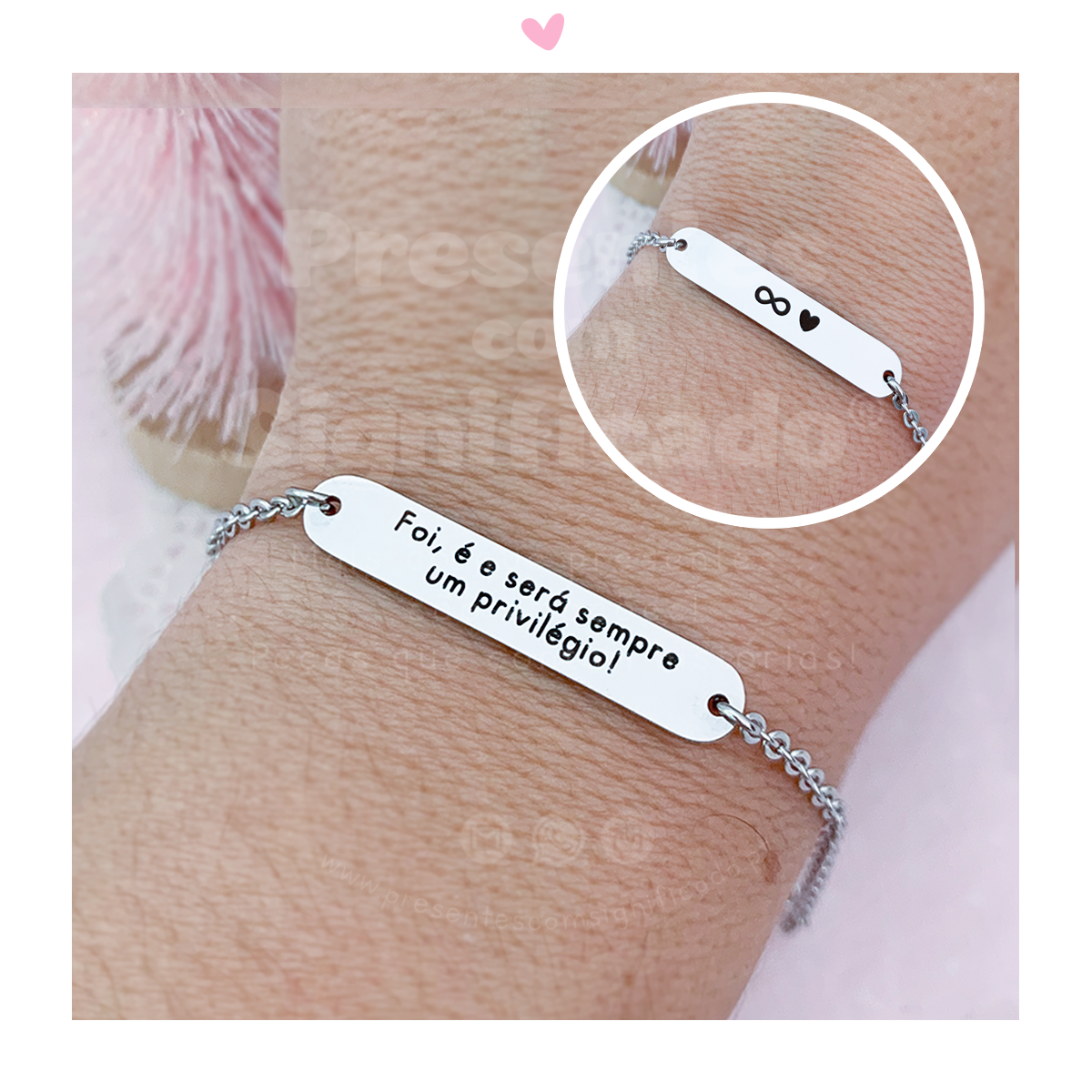 Pulseira c/ corrente totalmente em aço inoxidável e ajustável. Travessão retangular c/ texto gravado a seu gosto e é possível acrescentar gravação no verso.