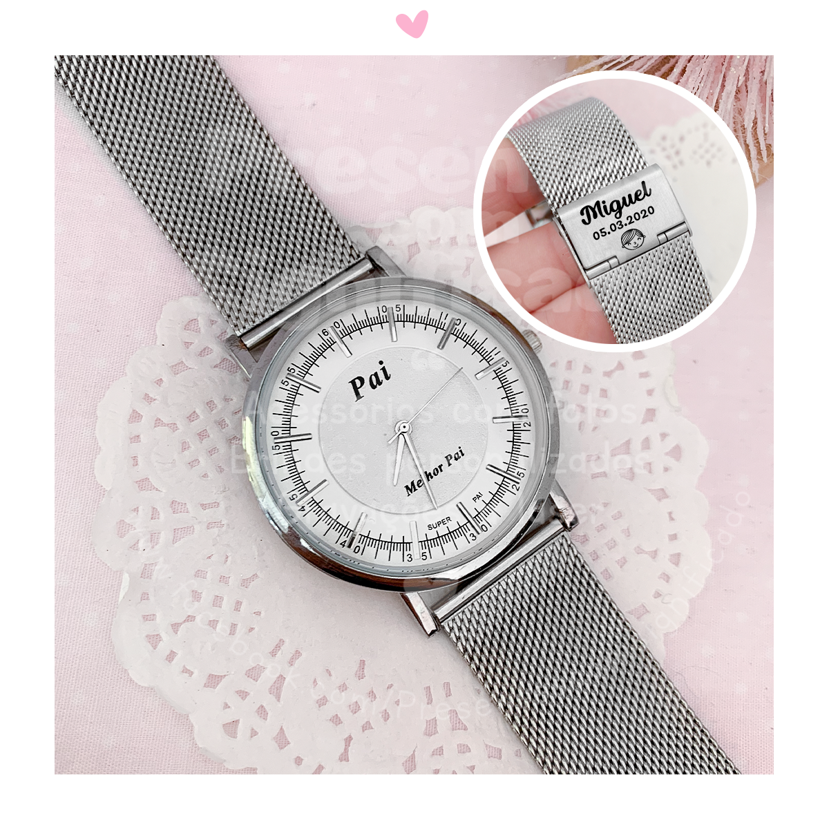 Relógio com bracelete em aço inoxidável e mostrador c/ layout masculino e texto "Pai - melhor pai".  Oferta de caixinha.