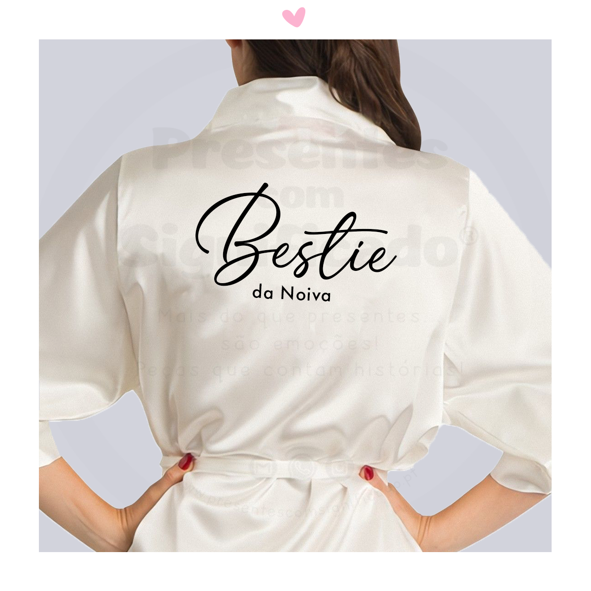 Robe acetinado com design estilo "quimono" personalizado com nome/data ou texto curto. A estampagem do texto pode ser feita COM ou SEM glitter. Seleccione abaixo nas opções.