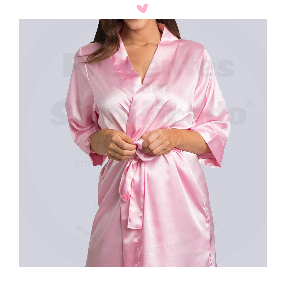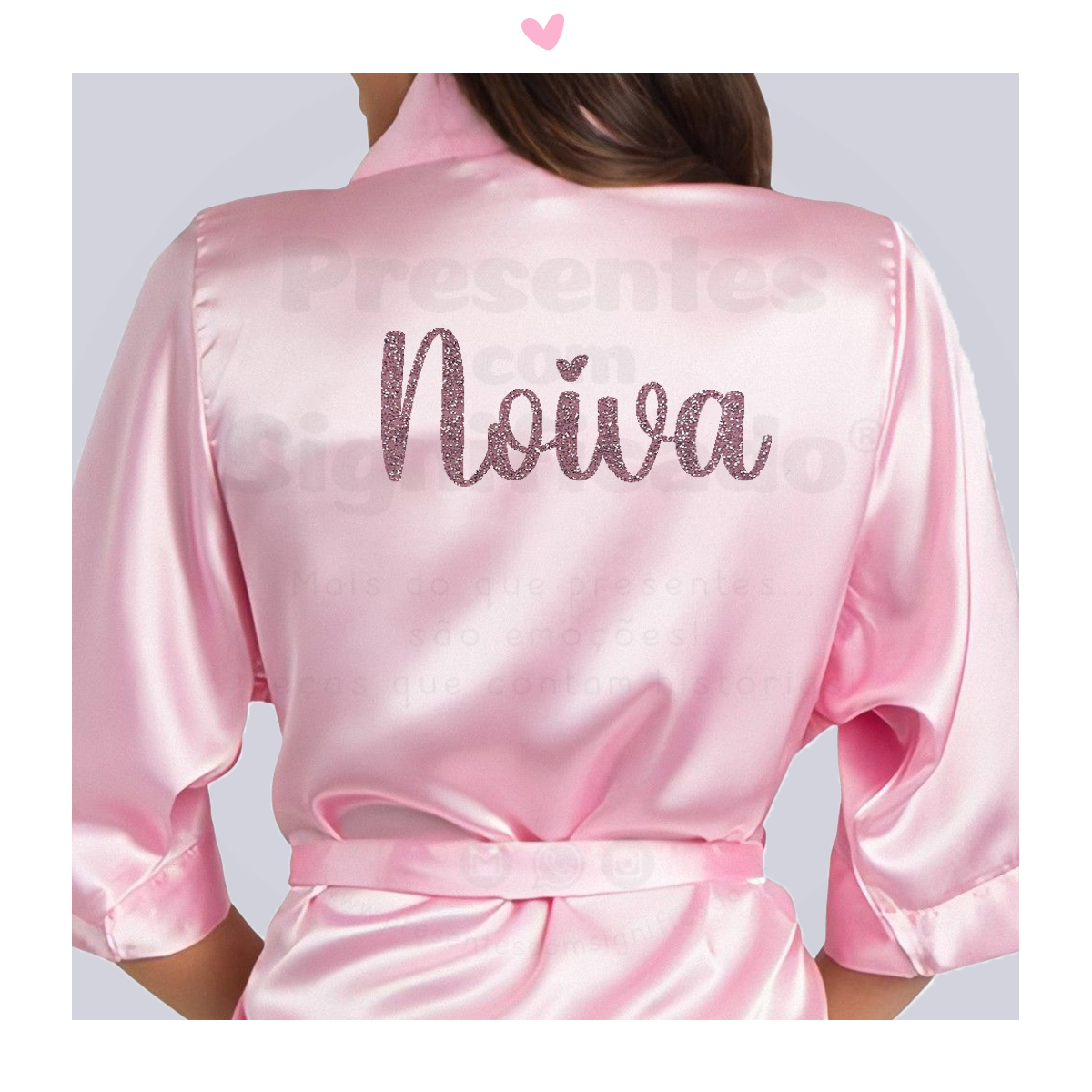 Robe acetinado com design estilo "quimono" personalizado com nome/data ou texto curto. A estampagem do texto pode ser feita COM ou SEM glitter. Seleccione abaixo nas opções.