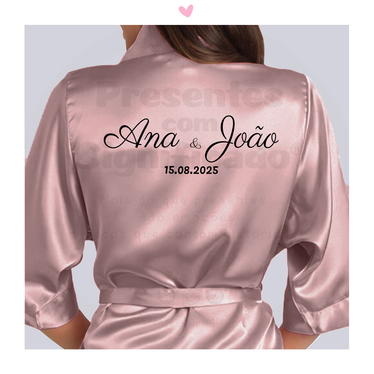 Robe acetinado com design estilo "quimono" personalizado com nome/data ou texto curto. A estampagem do texto pode ser feita COM ou SEM glitter. Seleccione abaixo nas opções.