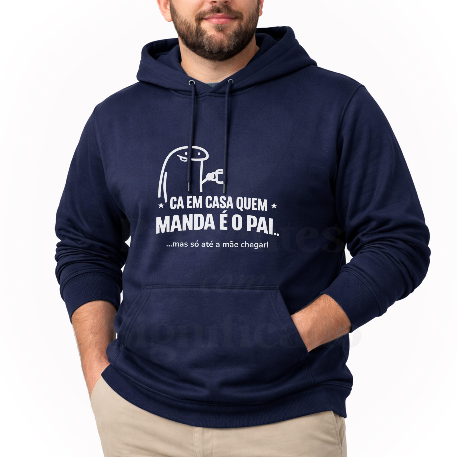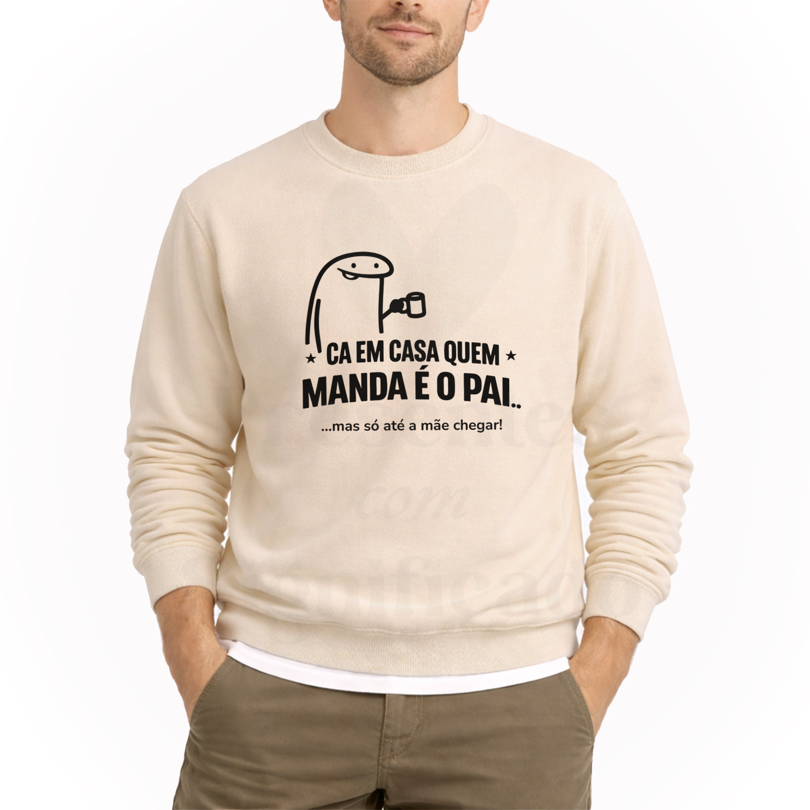 Sweatshirt (lisa, SEM capuz) ou Hoodie (COM capuz e bolso frontal) em algodão e poliéster de 300g. Tecido cardado por dentro com punhos e cós reforçado personalizado com texto "Cá em casa quem manda é o pai... mas só até a mãe chegar!".