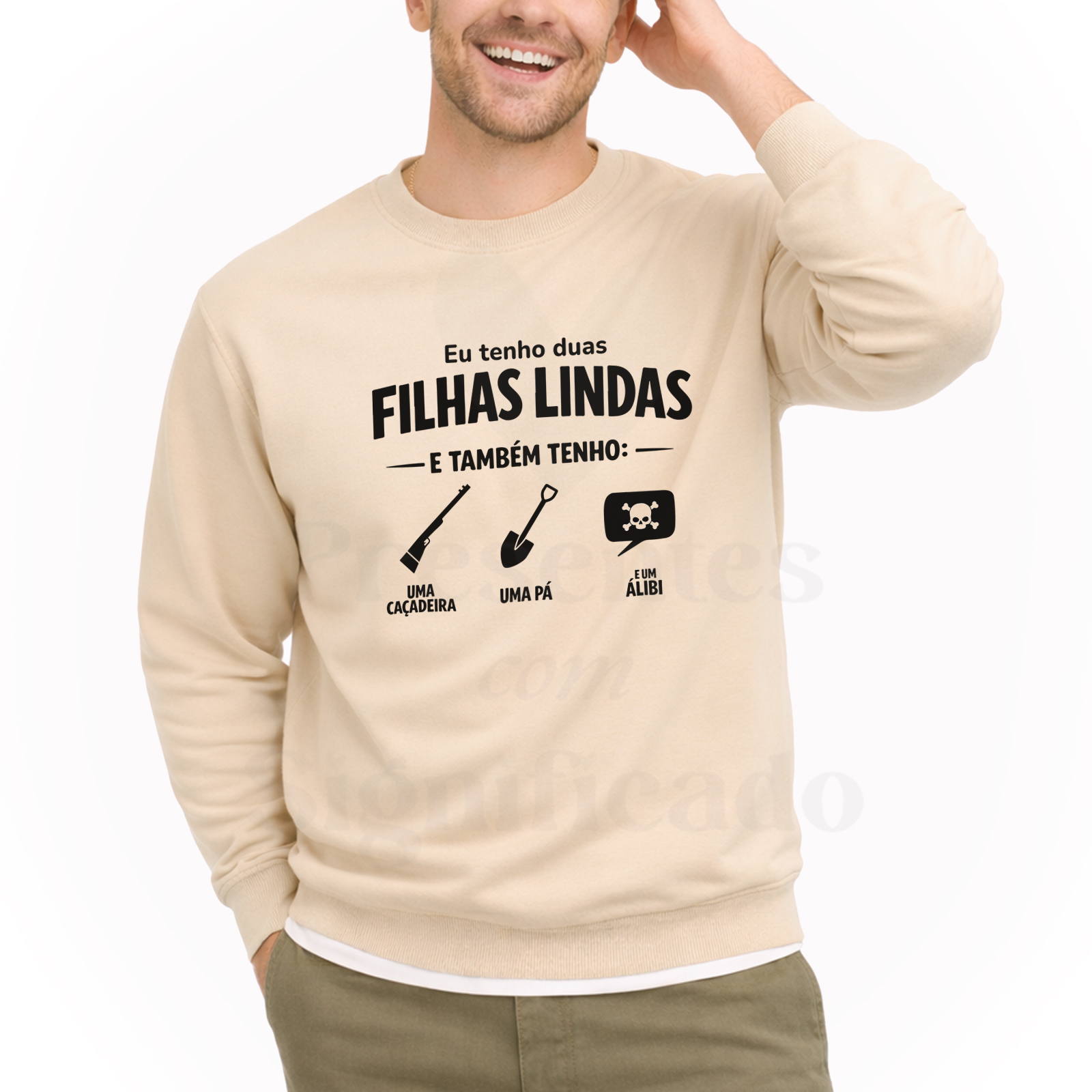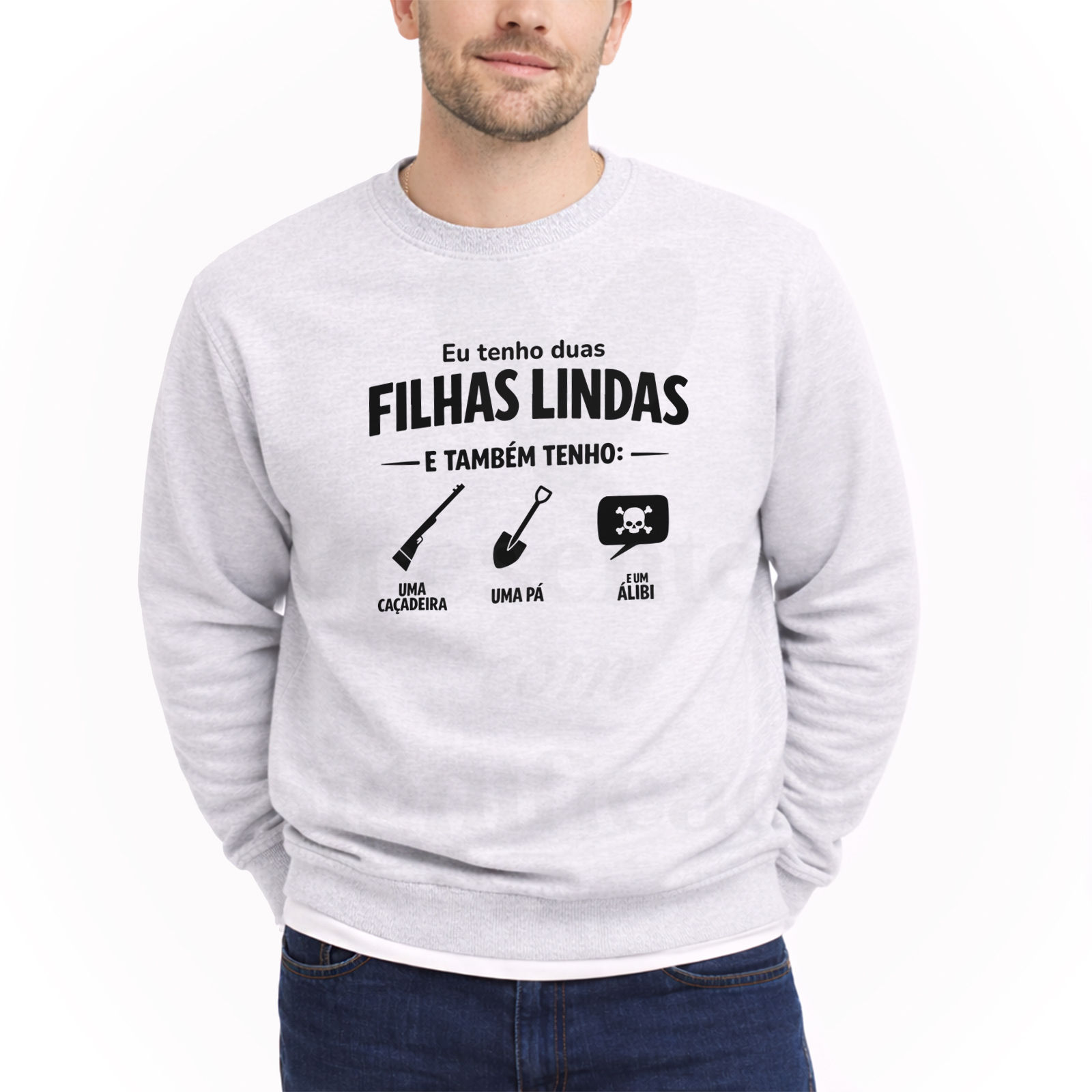 Sweatshirt (lisa, SEM capuz) ou Hoodie (COM capuz e bolso frontal) em algodão e poliéster de 300g. Tecido cardado por dentro com punhos e cós reforçado. Personalizado com texto "Eu tenho duas filhas lindas... e também tenho uma caçadeira, uma pá e um alibi" (outras opções disponíveis)