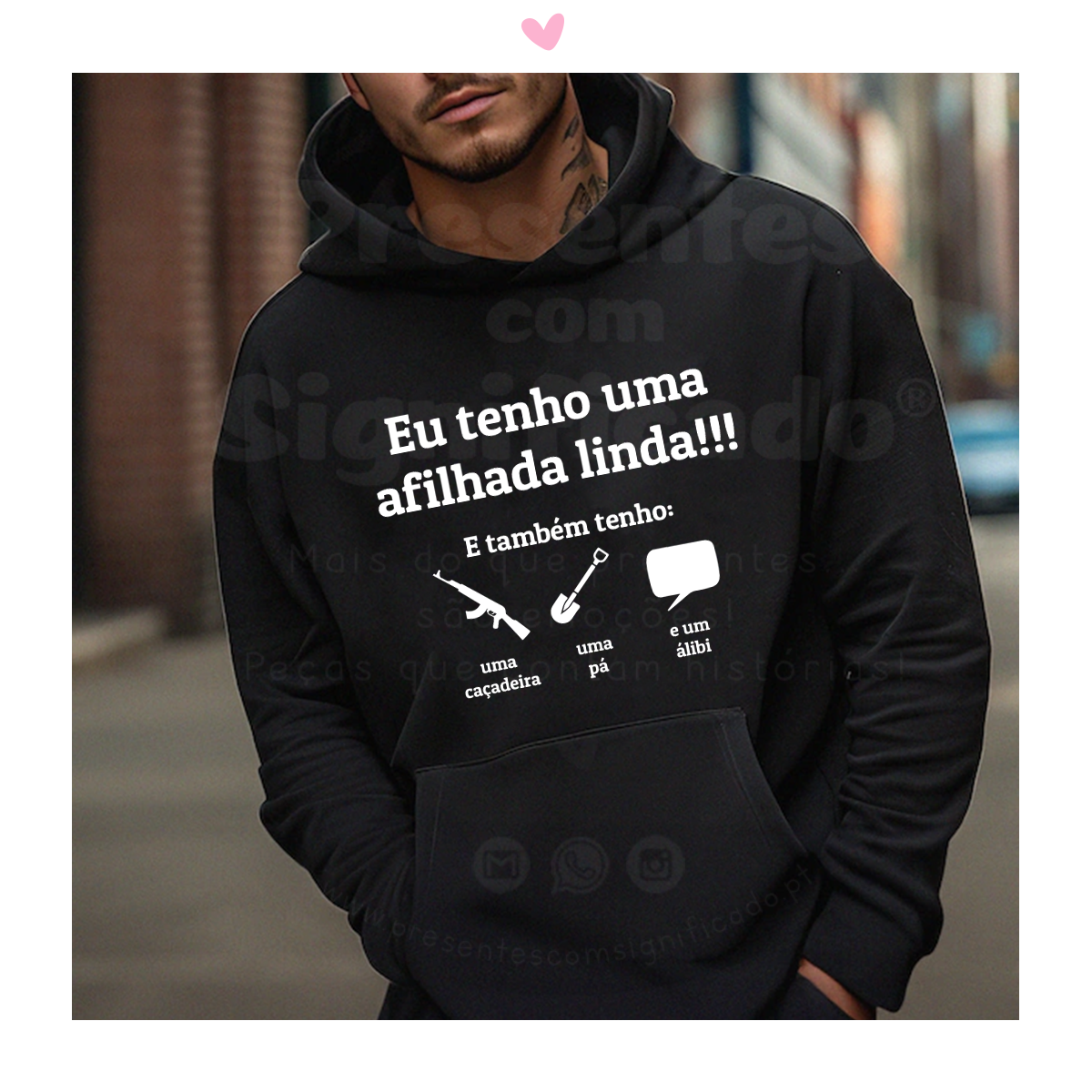 Sweatshirt (lisa SEM capuz) ou Hoodie (COM capuz e bolso frontal). Ambos em algodão e poliéster de 290g. Tecido cardado por dentro com punhos e cós reforçado. Personalizado com texto "Eu tenho uma afilhada linda... e também tenho uma caçadeira, uma pá e um alibi". Disponível em preto ou cinza mesclado.