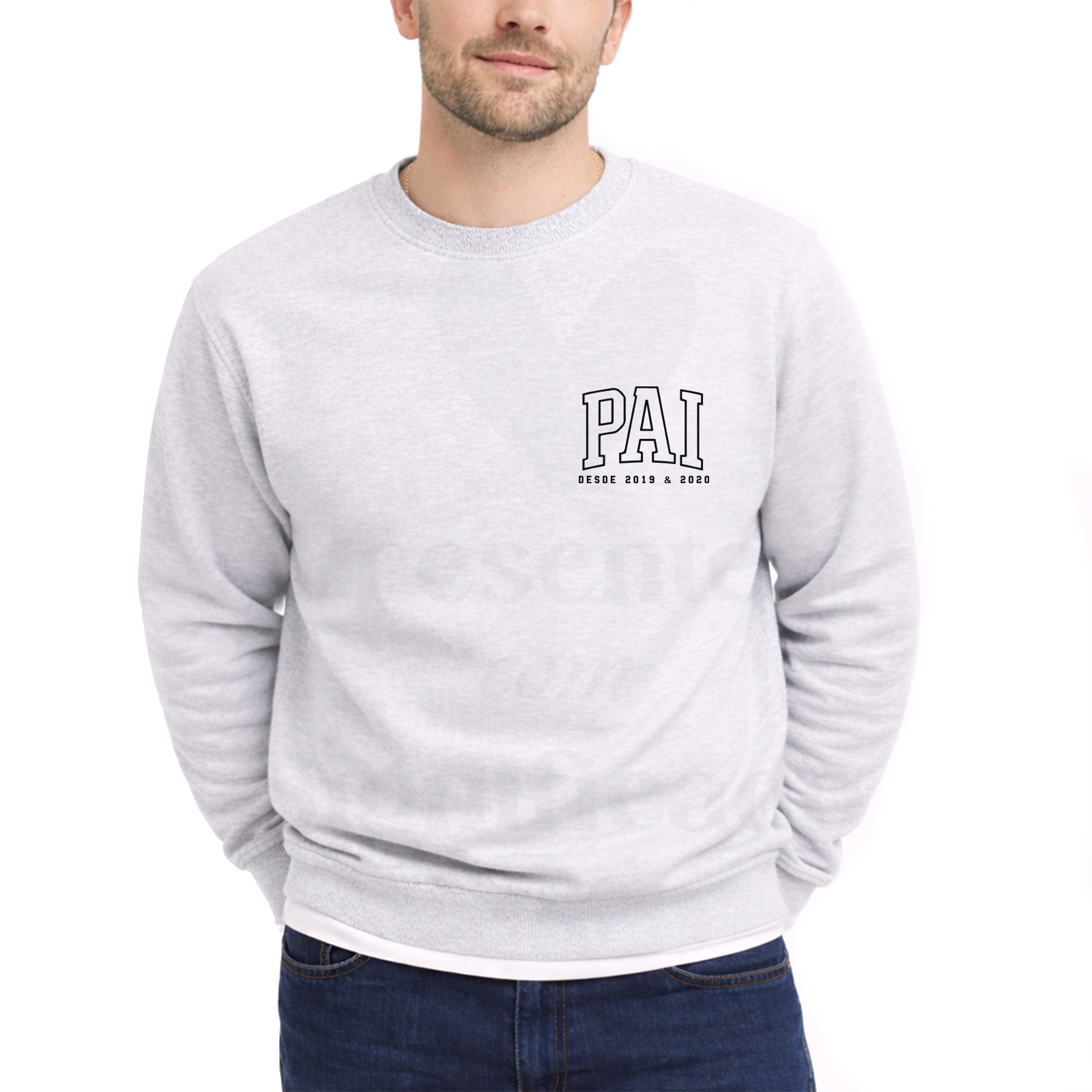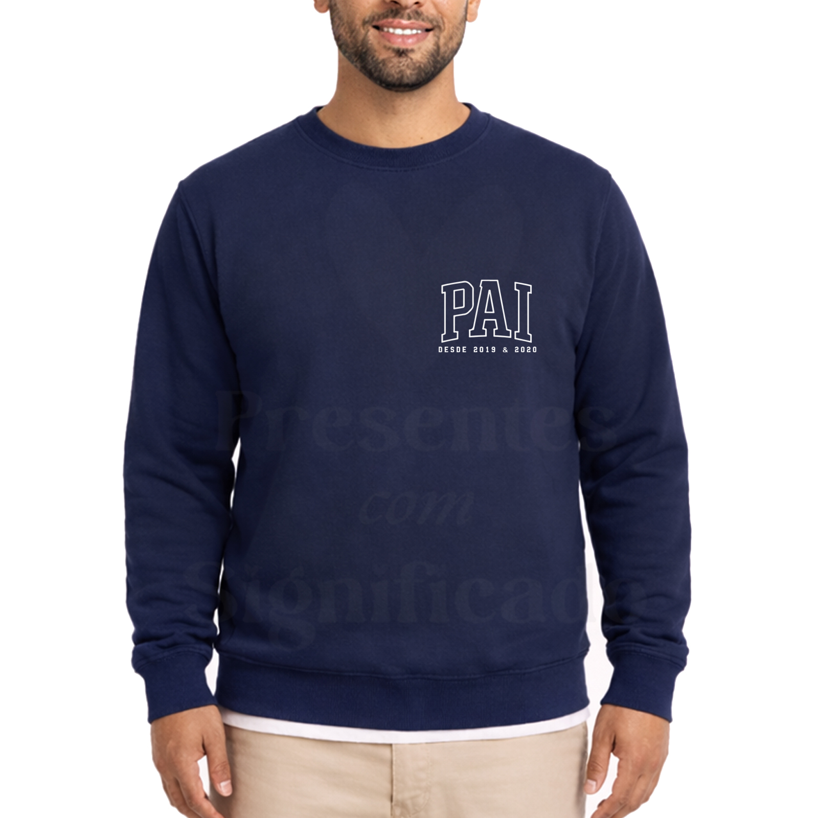 Sweatshirt (lisa, SEM capuz) ou Hoodie (COM capuz e bolso frontal) em algodão e poliéster de 300g. Tecido cardado por dentro com punhos e cós reforçado, personalizado com design simples, na lateral esquerda com texto PAI desde...