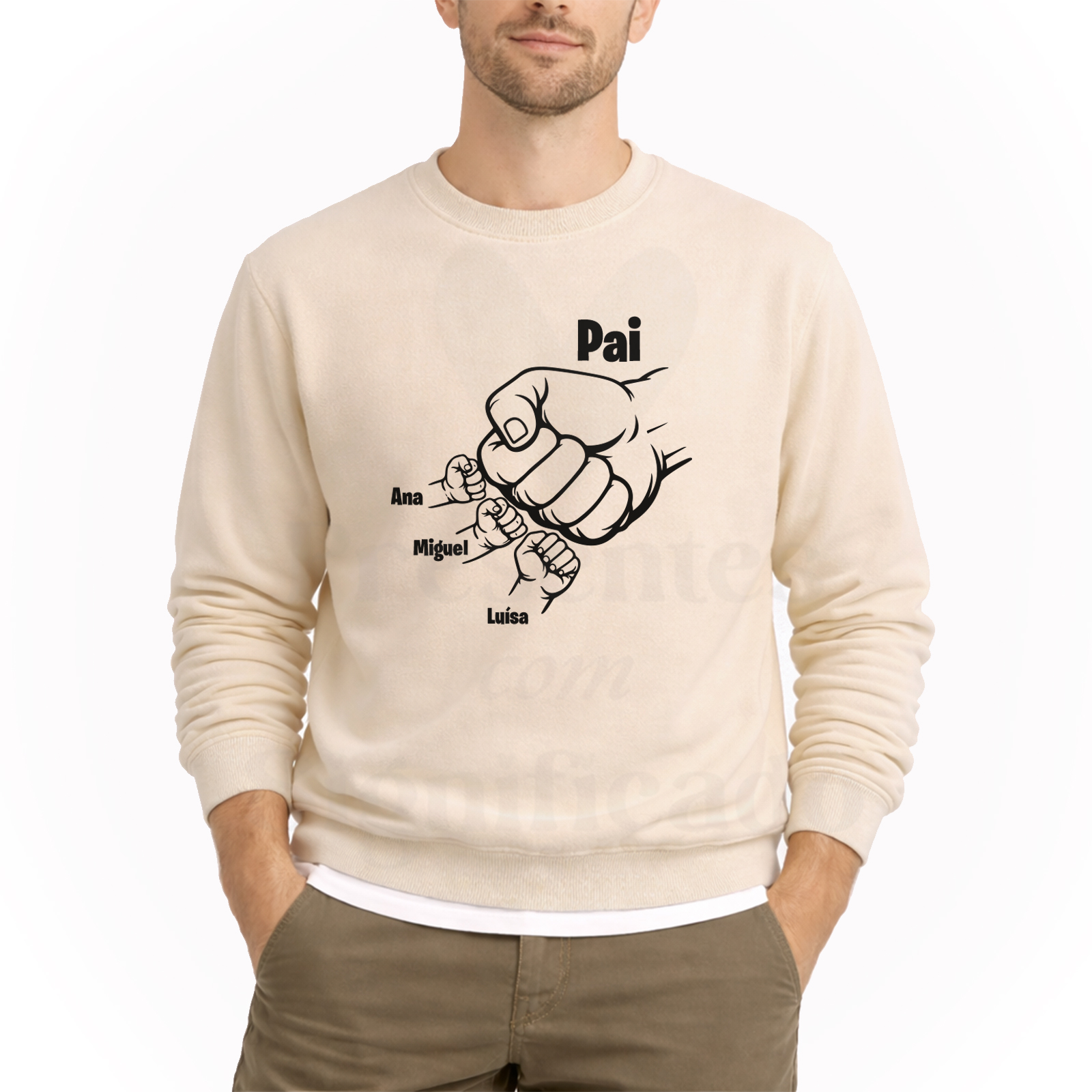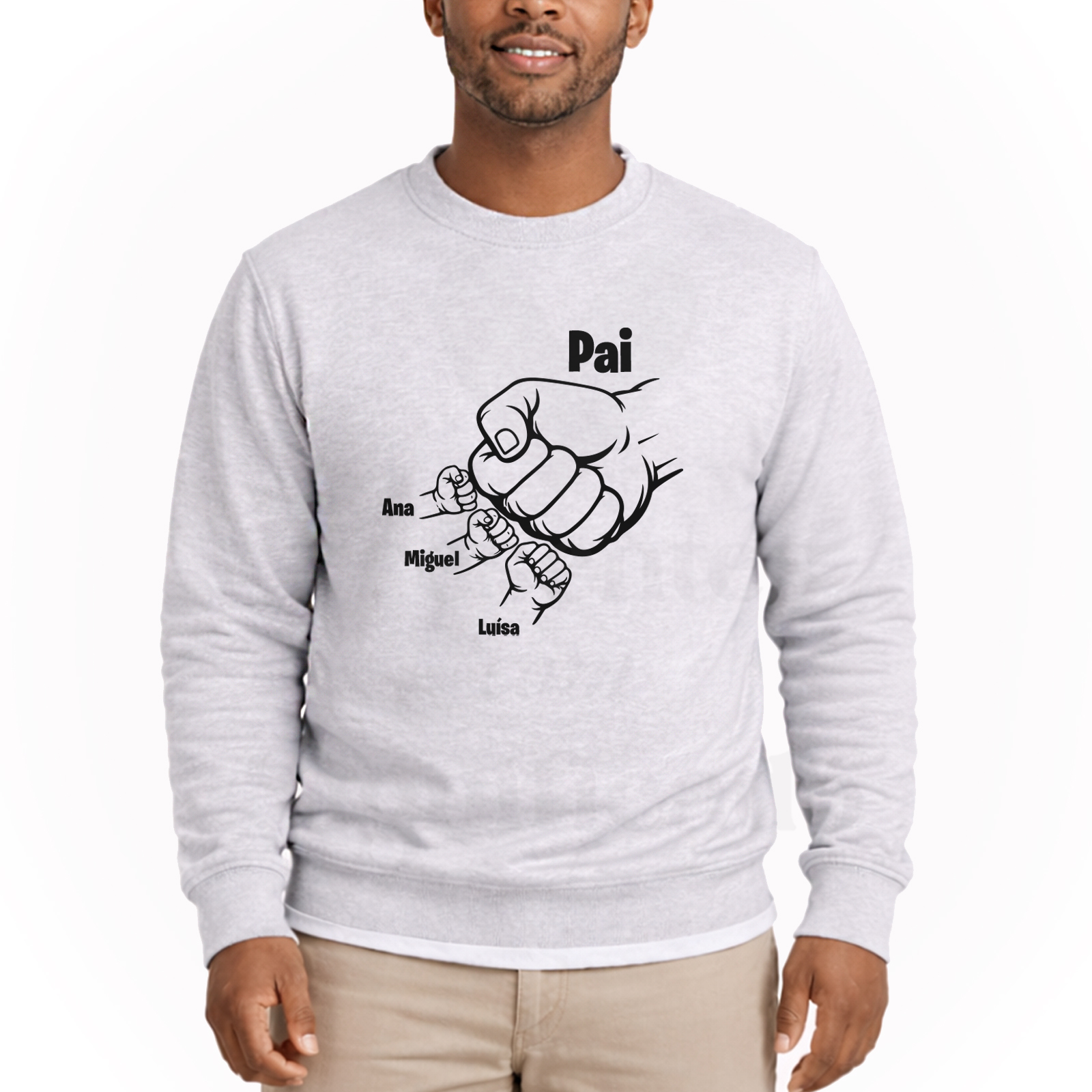 Sweatshirt (lisa, SEM capuz) ou Hoodie (COM capuz e bolso frontal) em algodão e poliéster de 300g. Tecido cardado por dentro com punhos e cós reforçado. Personalizado com desenho de Punhos simbolizando Pai e filhos. Adaptável para Avô, Padrinho, Tio...
