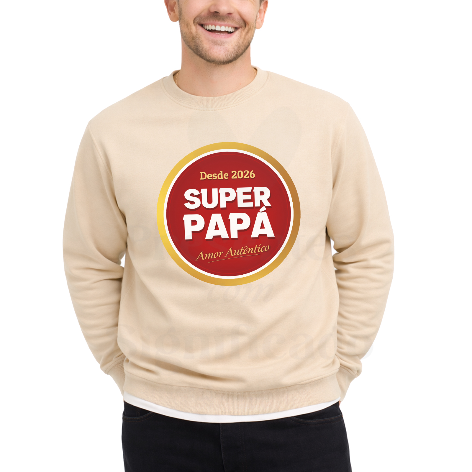 Sweatshirt (lisa, SEM capuz) ou Hoodie (COM capuz e bolso frontal) em algodão e poliéster de 300g. Tecido cardado por dentro com punhos e cós reforçado. Personalizado com texto "Super-Pai, Amor autêntico... desde xxx"".