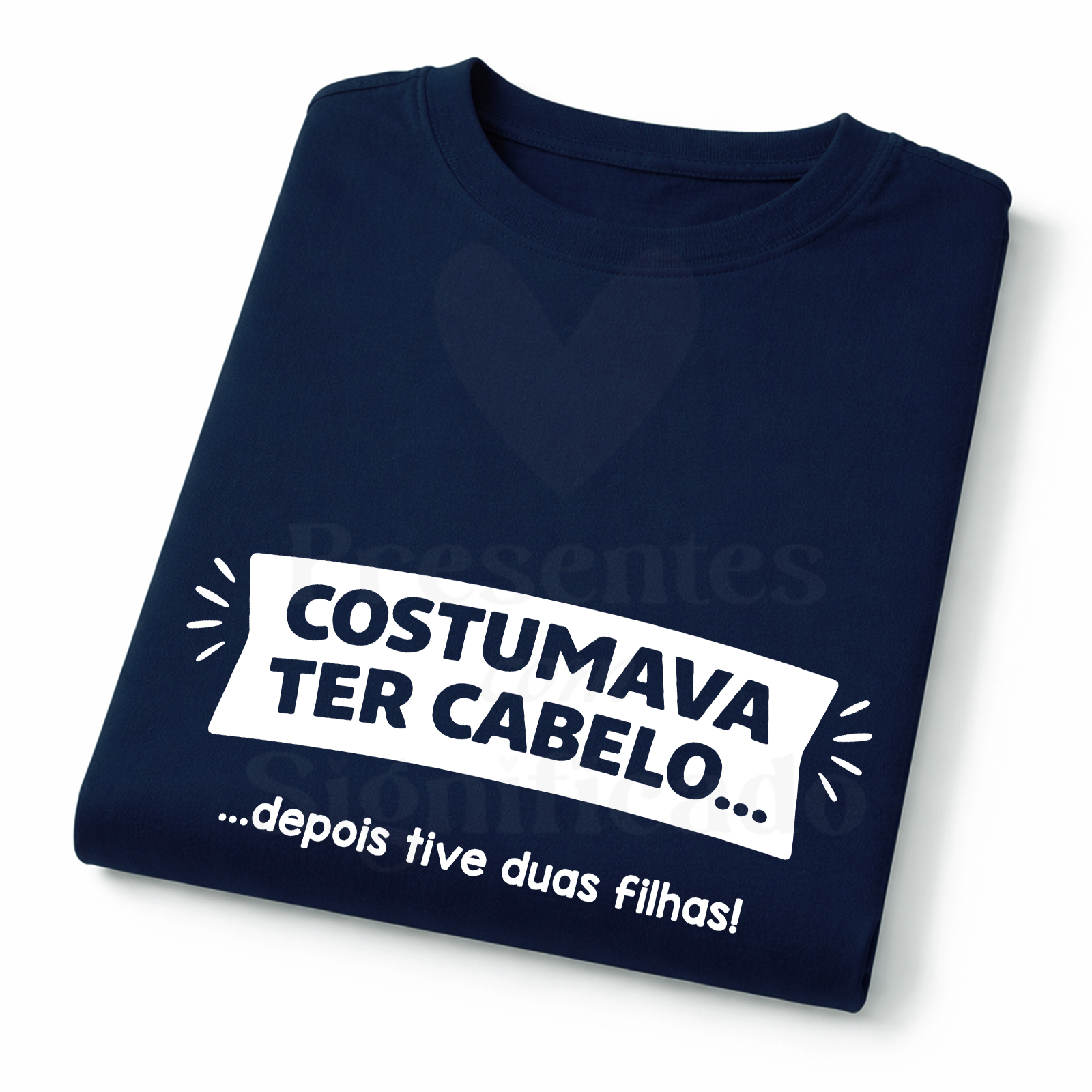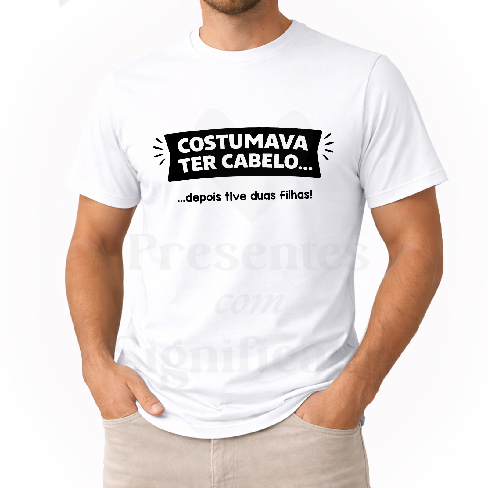 T-shirt 100% algodão de 190g personalizada com texto "Costumava ter cabelo... depois tive filhos!".