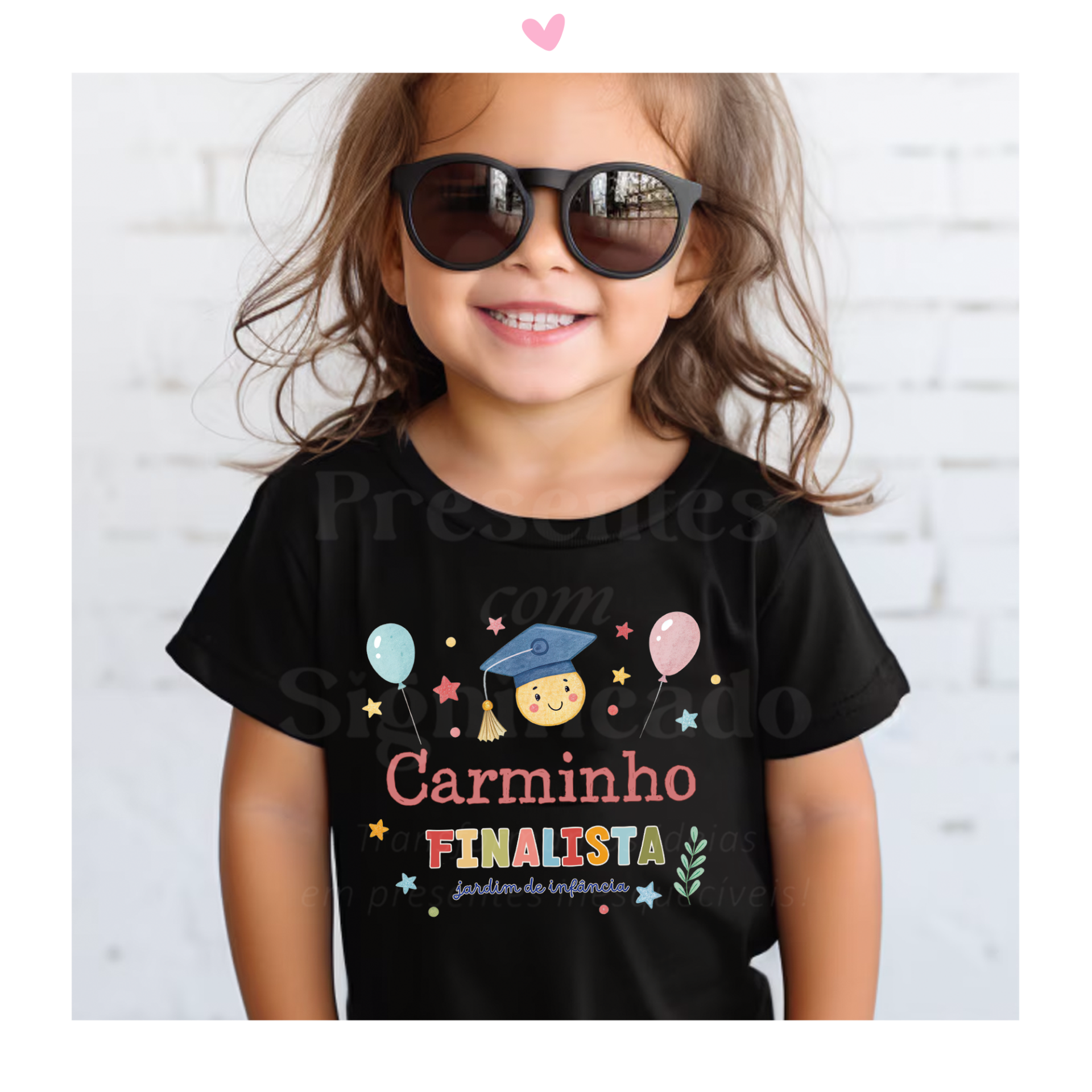 T-shirt 100% algodão de 190g personalizada com design "finalista". Personalize o nome e é possível acrescentar o ano ou outros detalhes como o nome da escola ou uma frase motivadora.