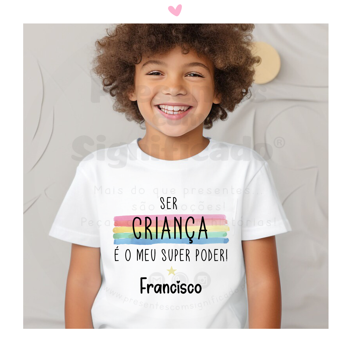 T-shirt 100% algodão de 190g personalizada com nome e frase "Ser criança é o meu super poder!".