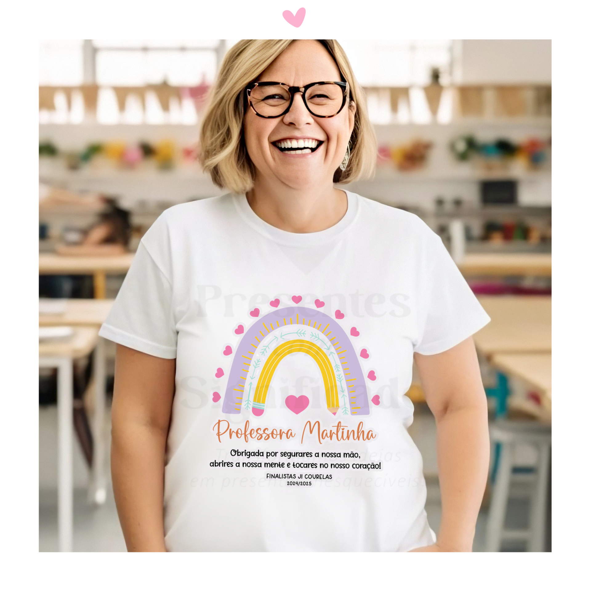 T-shirt 100% algodão de 190g personalizada com design colorido arco-íris. Personalize o nome da educadora/professora e o texto a colocar.
