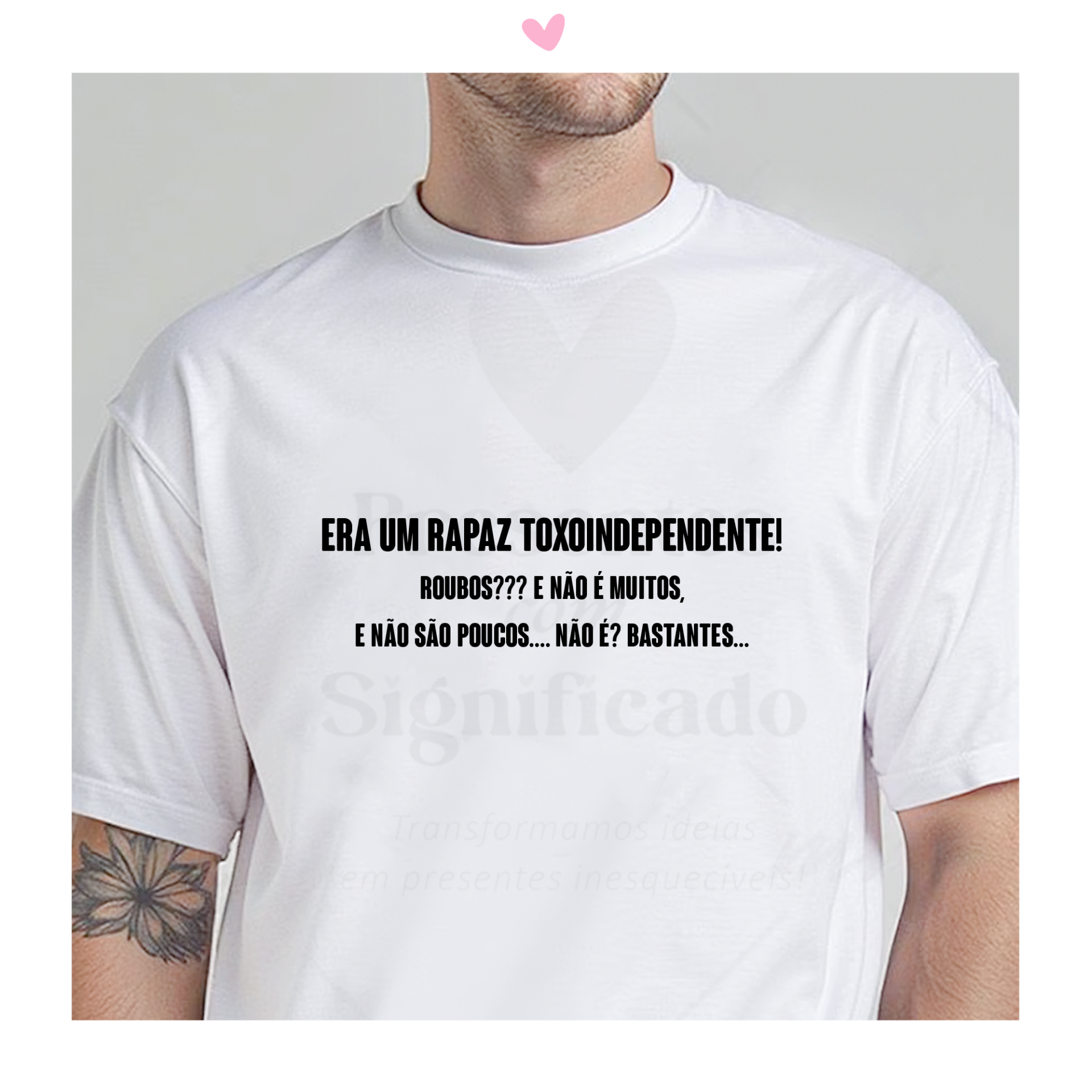 T-shirt 100% algodão de 190g personalizada com frase "Era um rapaz toxoindependente! Roubos??? E não é muitos, e não são poucos.... não é? bastantes..."