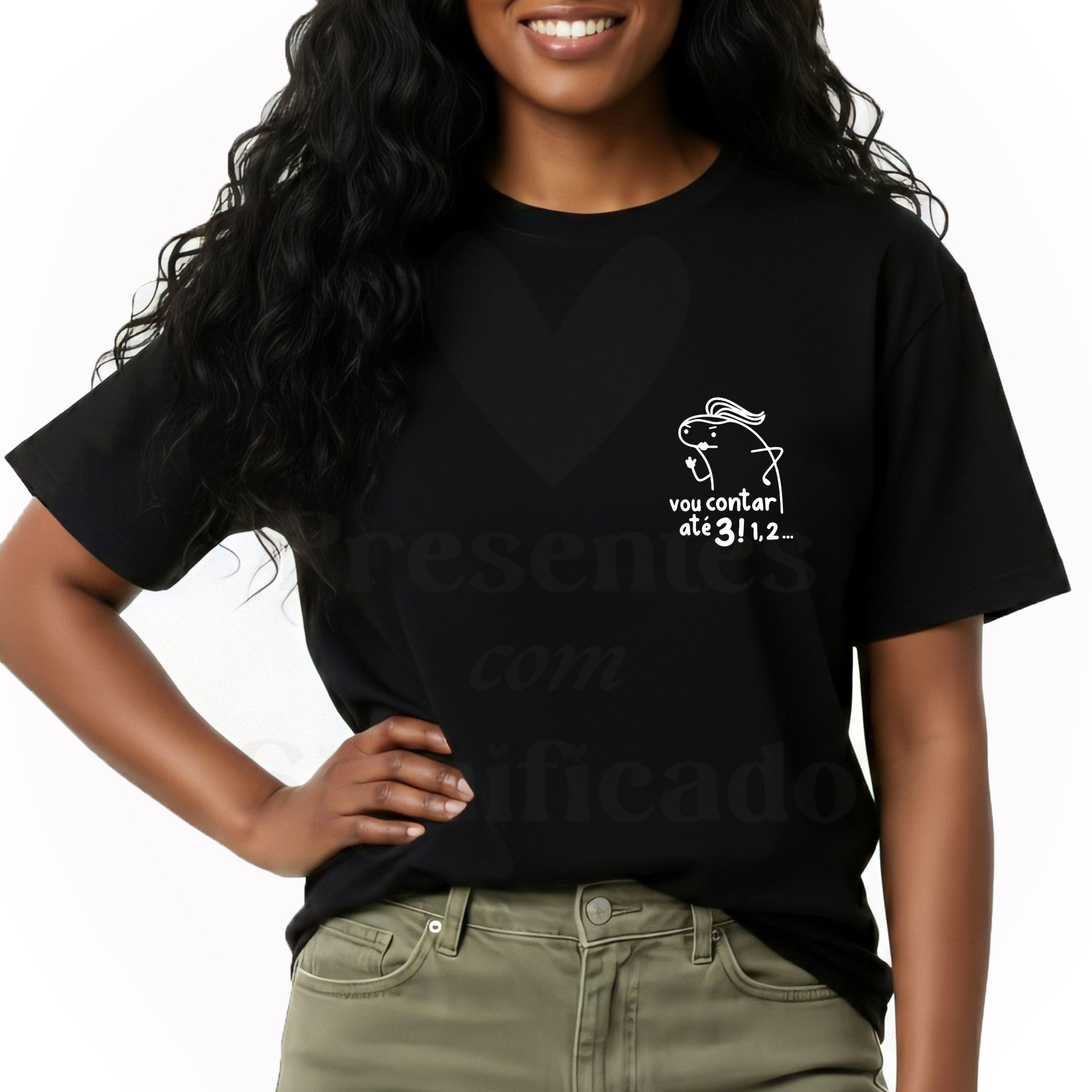 T-shirt 100% algodão de 190g personalizada com desenho Flork e texto "Vou contar até 3! 1, 2...".