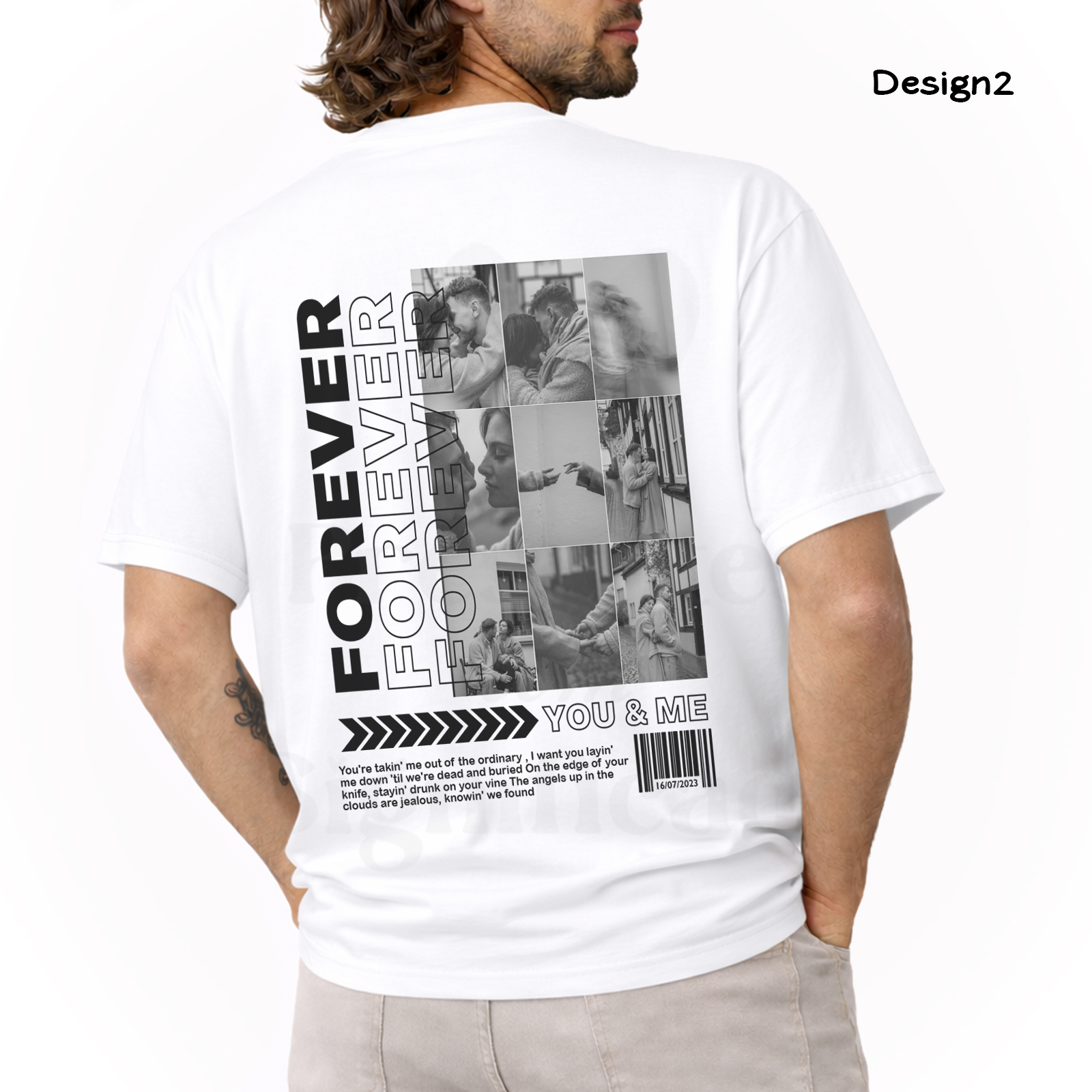 T-shirt 100% algodão de 190g personalizada com palavra a gosto (Ex: Namorada, Only You, Forever, Always...) as vossas fotos (a preto e branco)**, excerto da vossa música e data especial. Se pretender uma frase ou excerto da música em específico, indique no campo dos detalhes a adicionar/alterar.
