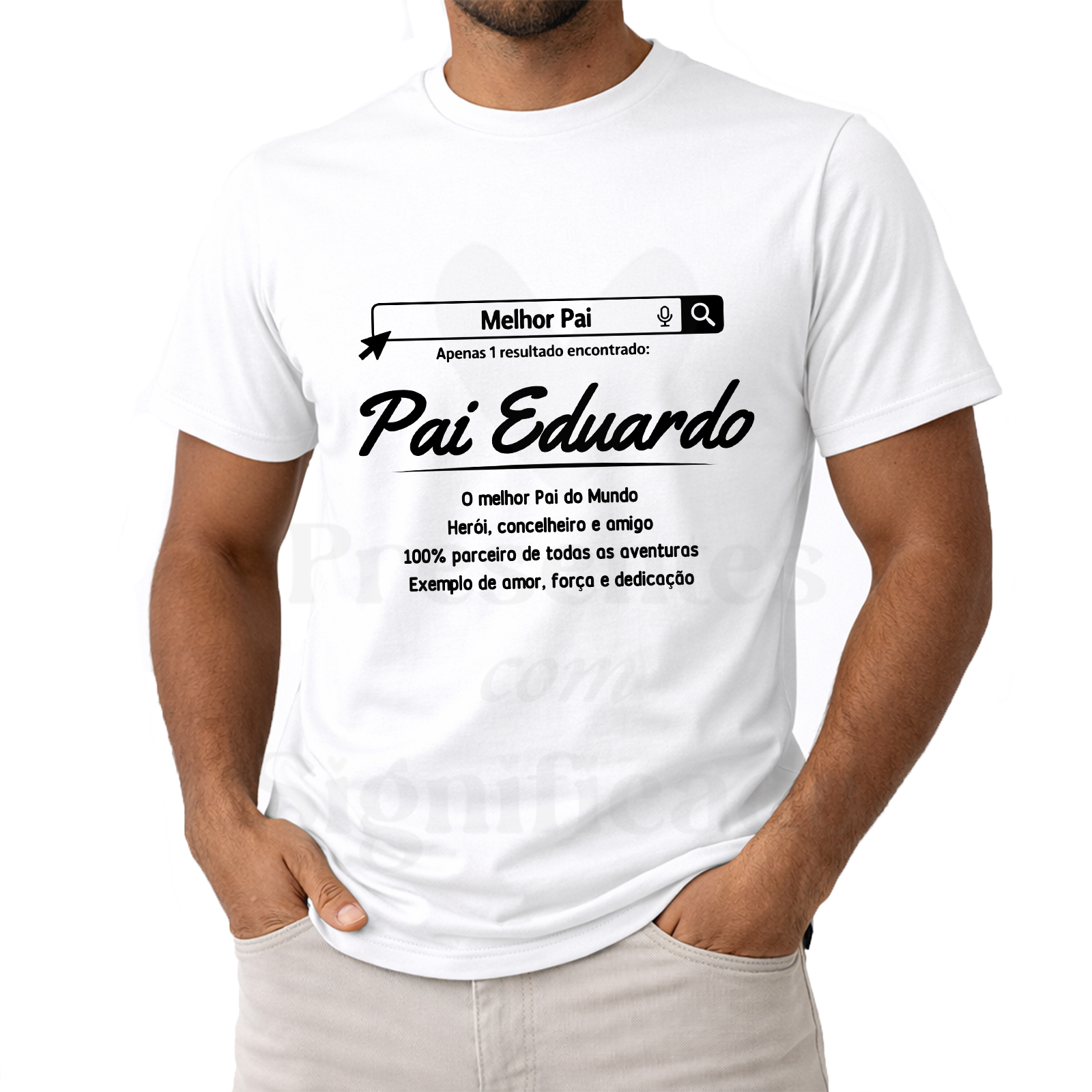 T-shirt 100% algodão de 190g personalizada com design de pesquisa do google, nome do pai e adjectivos.