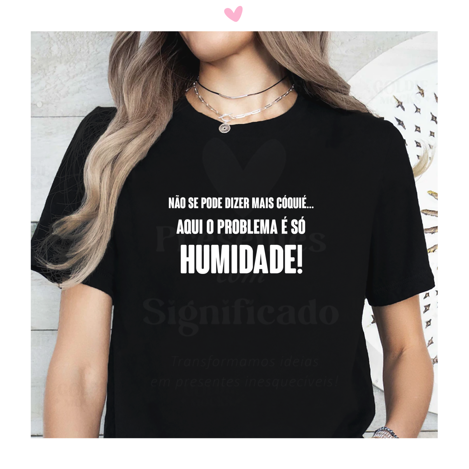 T-shirt 100% algodão de 190g personalizada com frase ""Não se pode dizer mais cóquié... aqui o problema é só humidade!"