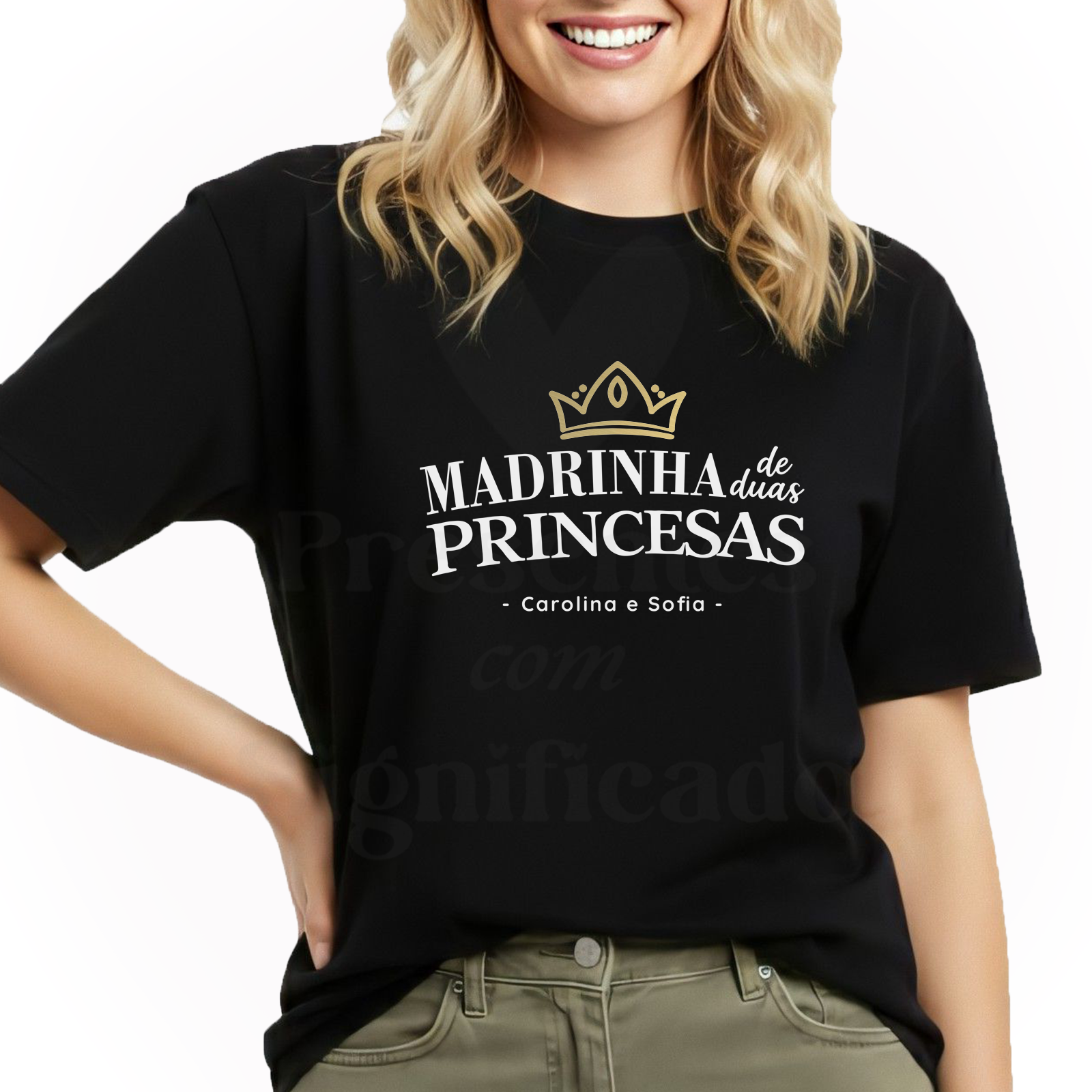 T-shirt 100% algodão de 190g personalizada com frase "Madrinha de uma princesa". Indique na personalização abaixo o nome da(s) afilhada(s).
