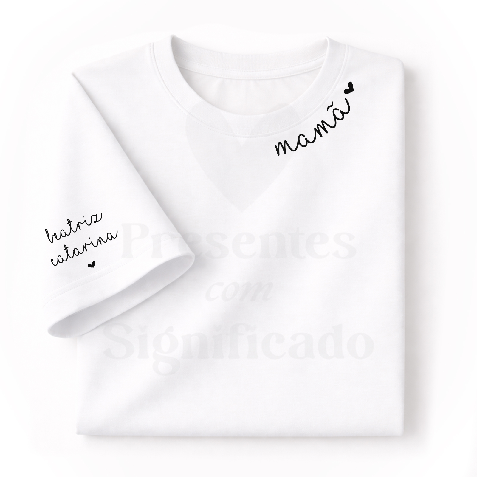 T-shirt 100% algodão de 190g personalizada abaixo da gola com a palavra "mamã" e na manga com o(s) nome(s) do(as) filho(as).