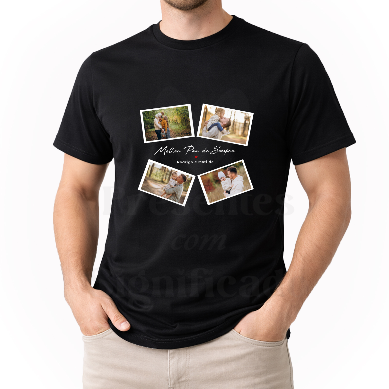 T-shirt 100% algodão de 190g personalizada com texto "Melhor Pai de Sempre" com nomes e adição de 4 fotos.
