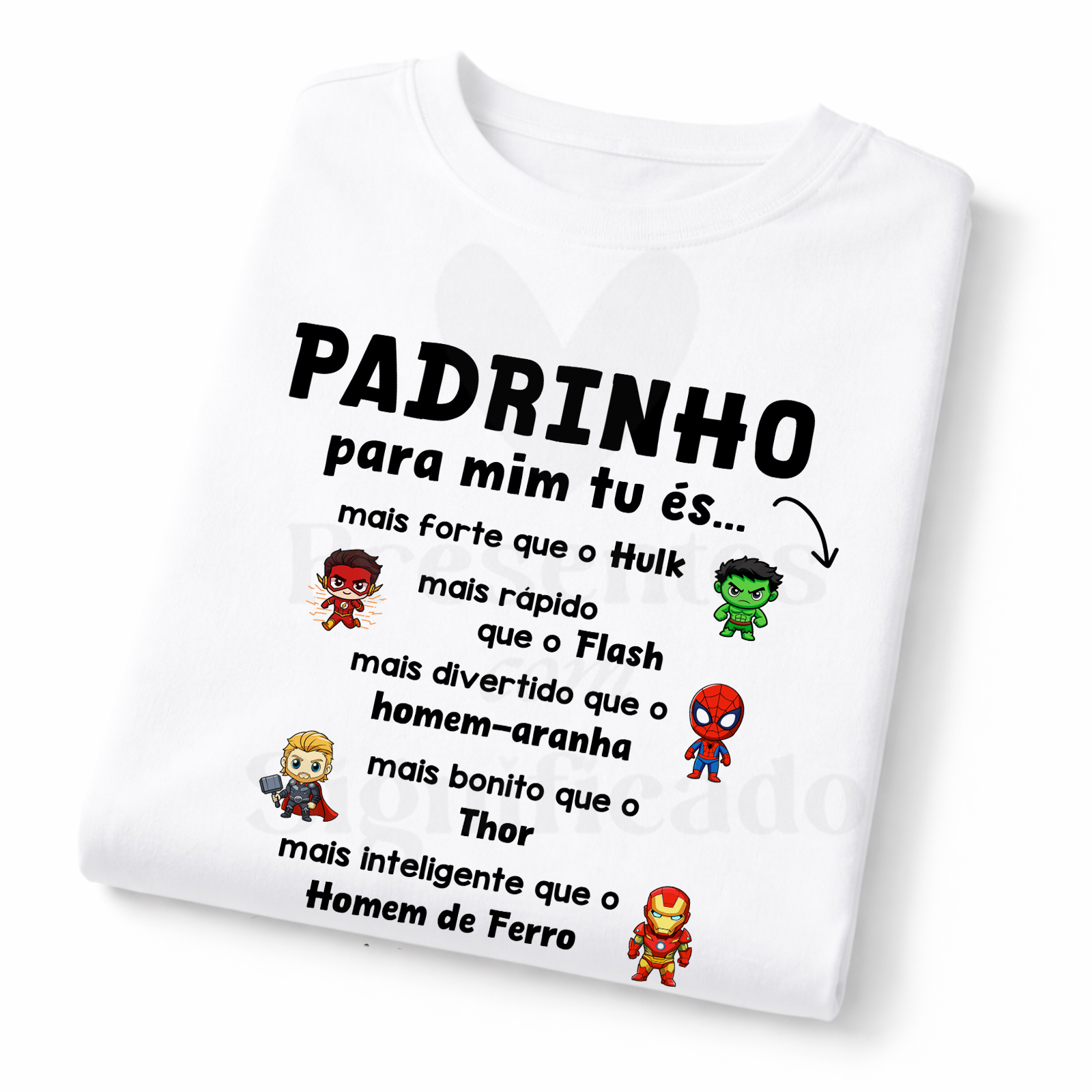 T-shirt 100% algodão de 190g personalizada com texto Padrinho na temática dos super-heróis. Possível acrescentar nomes/datas.