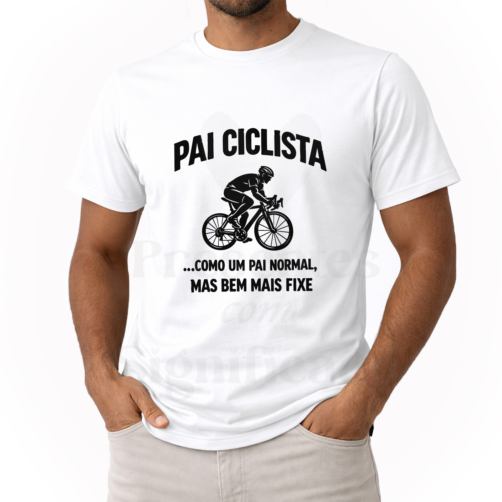 T-shirt 100% algodão de 190g personalizada com texto "Pai ciclista, como um pai normal mas bem mais fixe...".