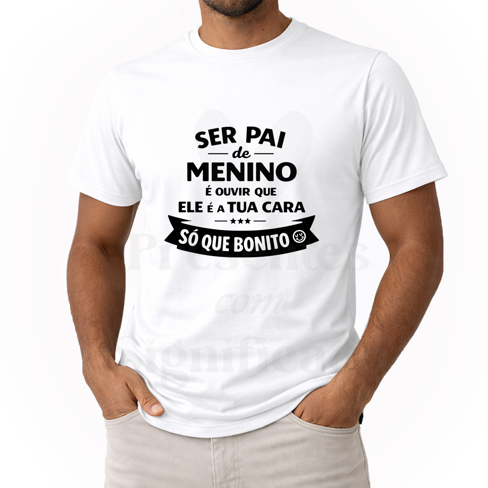 T-shirt 100% algodão de 190g personalizada com texto "Ser pai de menino é ouvir que ele é a tua cara... só que bonito"