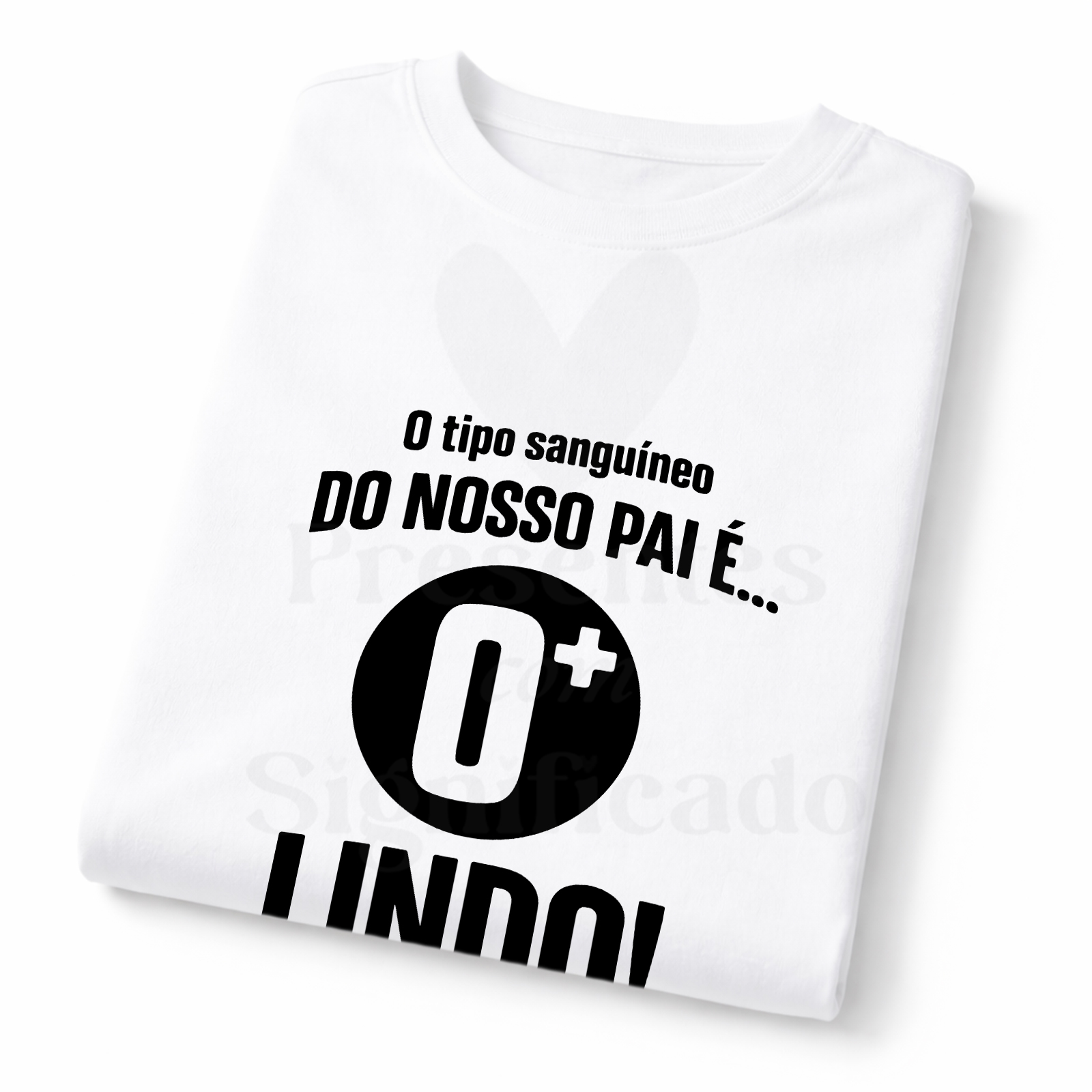 T-shirt 100% algodão de 190g personalizada com texto "O tipo sanguíneo do nosso Pai é O+ lindo!".