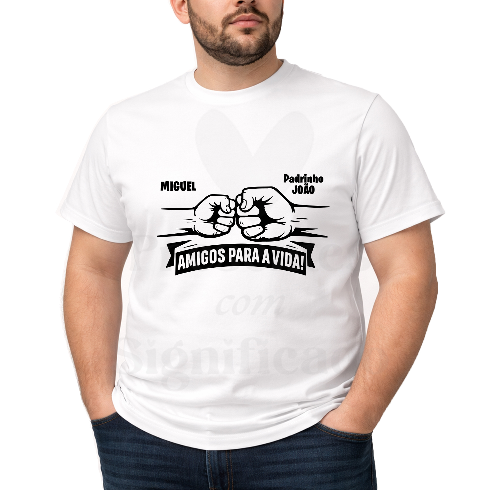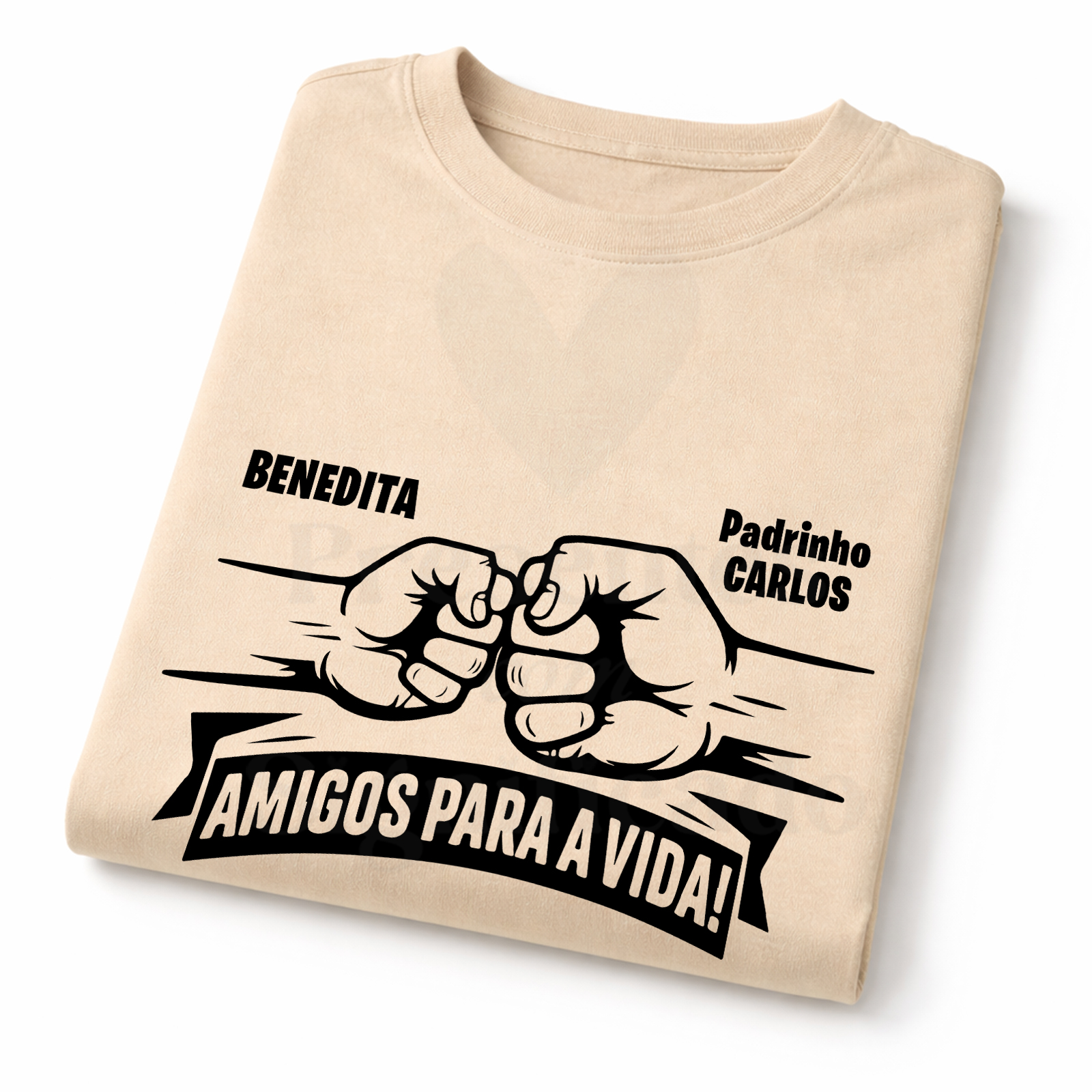 T-shirt 100% algodão de 190g personalizada com desenho de Punhos simbolizando Padrinho e afilhado(s).