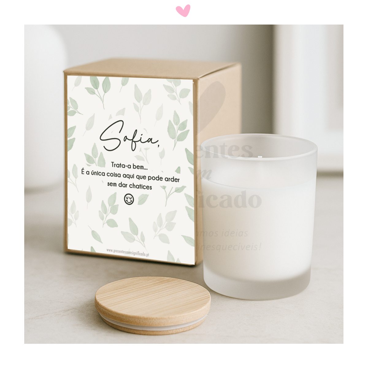 Vela aromática de baunilha em frasco de vidro, com tampa de bambu e frase "Para queimar o cheiro a más decisões amorosas." Com caixinha e dedicatória personalizada.