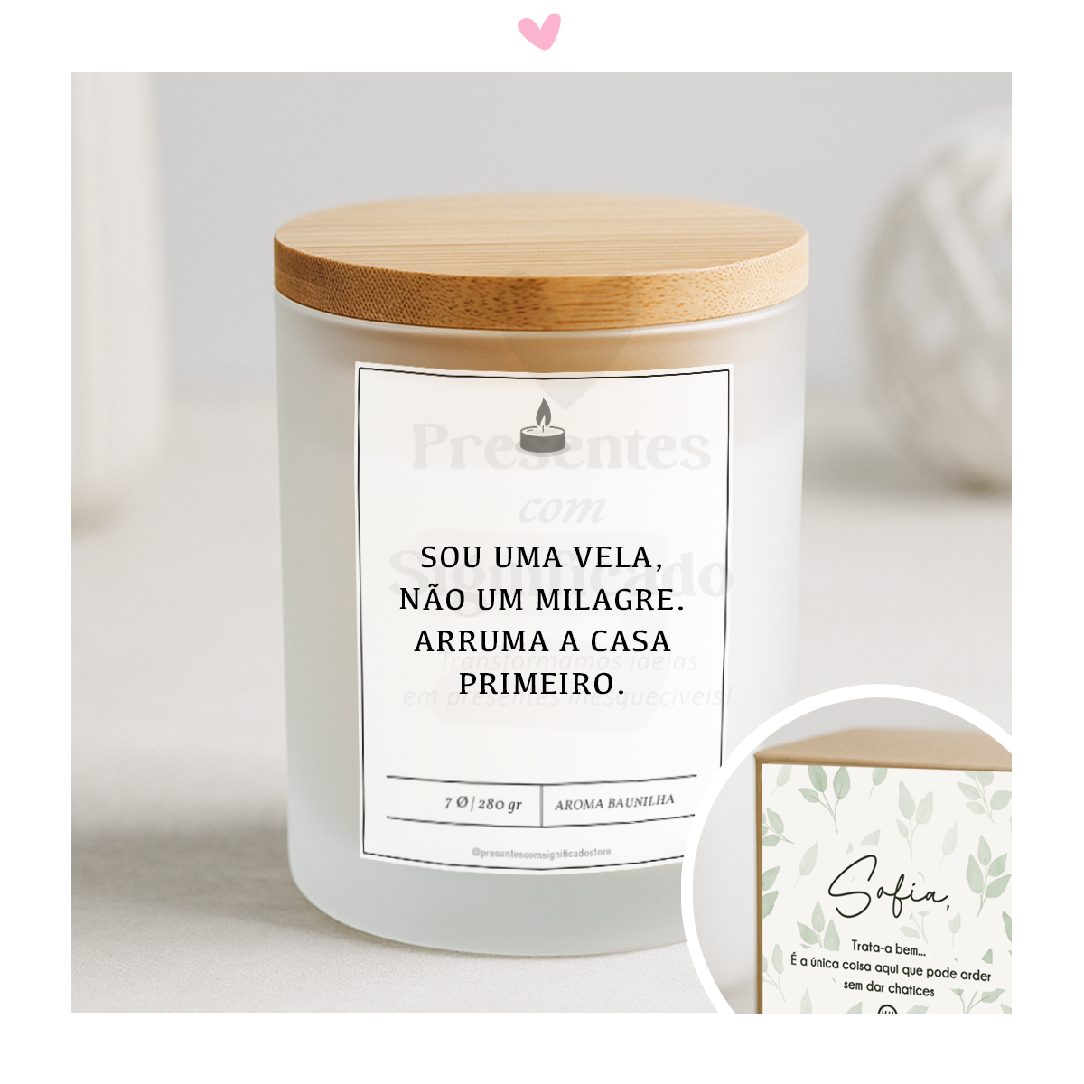 Vela aromática de baunilha em frasco de vidro, com tampa de bambu e frase personalizada. Sugestão: "Sou uma vela, não um milagre. Arruma a casa primeiro." Aplicamos outra frase a seu gosto. Com caixinha e dedicatória personalizada.
